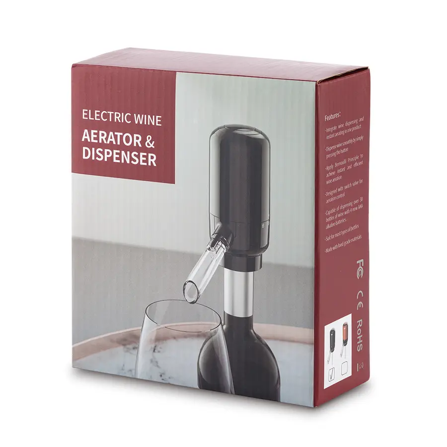 Dispensador de vino que integra el proceso de aireado en un solo producto presionando el botón. 4 pilas AAA no incluidas. Empaque Caja Individual.