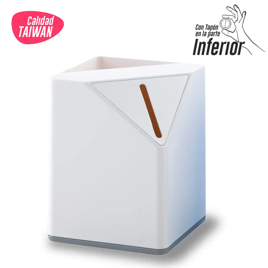 Alcancía plástica con portabolígrafo. Tapa giratoria en la base. No incluye bolígrafos.