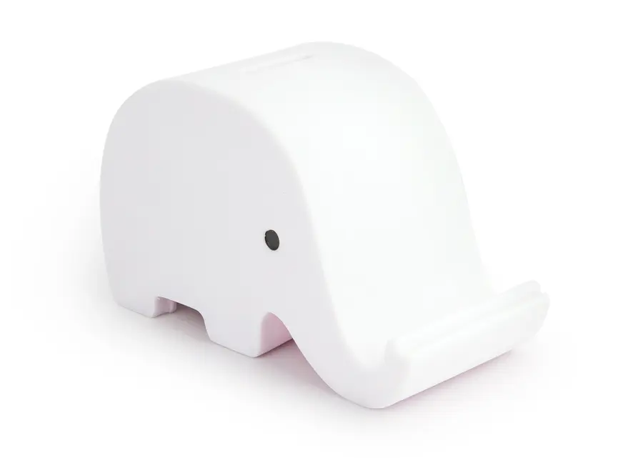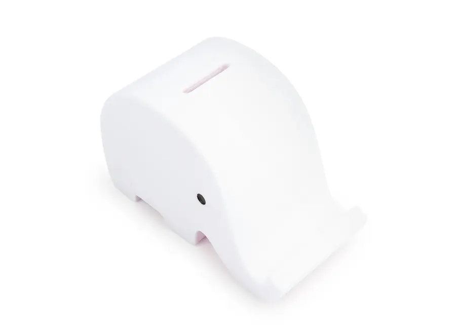 Alcancía con diseño de elefante. Su trompa sirve como holder para celular. Con tapón en la parte inferior para vaciar la alcancía.