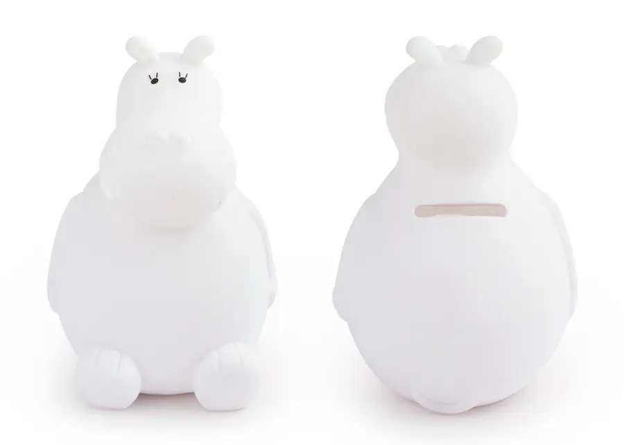 Alcancía en forma de tierno hipopótamo, tamaño ideal. Con tapón en la parte inferior para vaciar la alcancía.