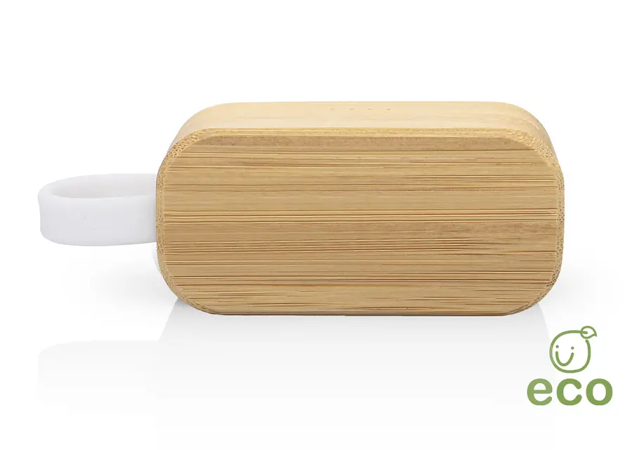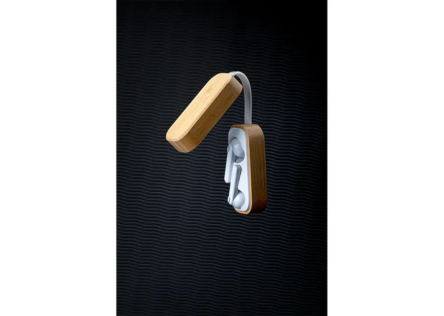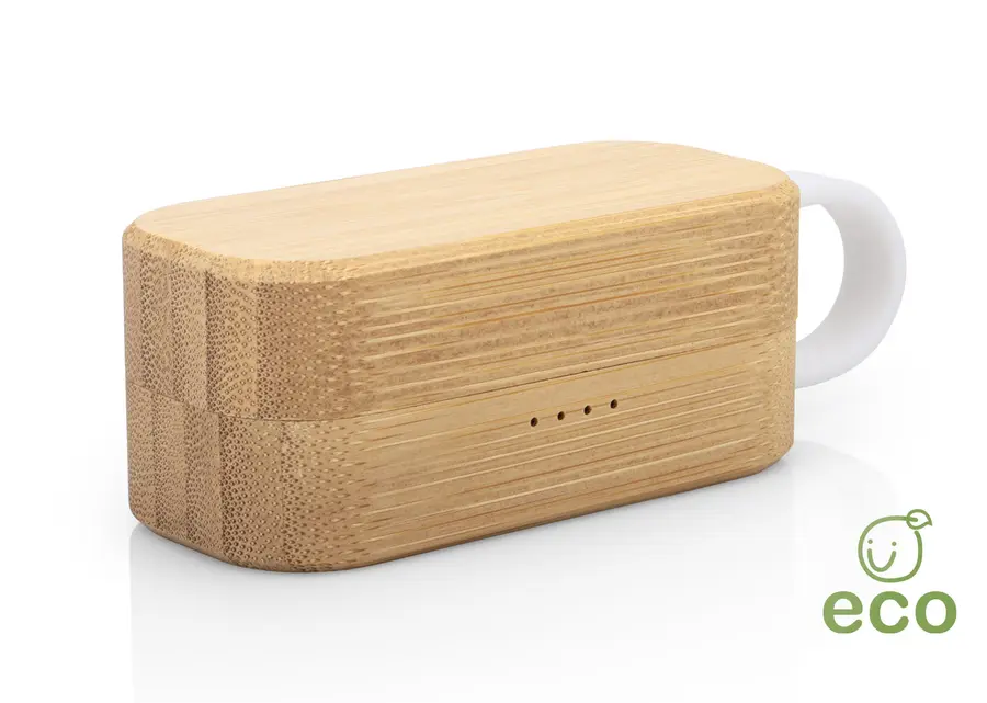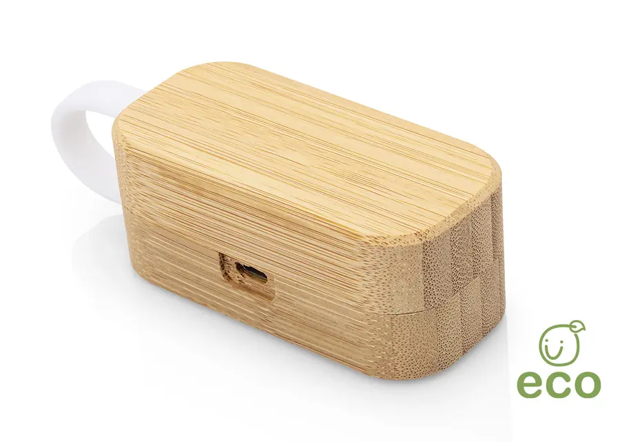 Audífonos inalámbricos TWS. Bluetooth versión 5.0, con cargador integrado en caja de Bambú y cierre imantado. Batería 3.7V/240mA. Incluye función para cargar los audífonos utilizando la tecnología Wireless sin necesidad de cables. Incluye cable de carga micro usb. Accesorio para carga Wirelles no incluido, se vende por separado