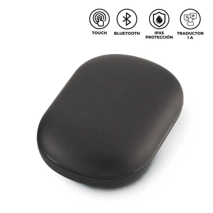 Audífonos Bluetooth plásticos. Versión del Bluetooth: 5.4. Capacidad de la batería: 500 mAh. Tiempo de carga del estuche: 3-4 horas. Tiempo de carga de los audífonos: 1 hora. Tiempo de reproducción: 4-6 horas. El estuche permite cargar los audífonos entre 3-4 veces. Mandos por touch. Resistente al agua (no sumergible), tecnología IPX5. Funcionan mediante inteligencia artificial y permiten traducir más de 140 idiomas (descargar la app con QR en instrucciones). Incluye cable Tipo C para carga. Empaque caja individual.