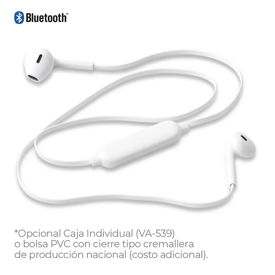 Audífonos Bluetooth plásticos intraauriculares con control de volumen. Capacidad de la batería interna 55mAh. Tiempo de carga 1.5h aprox. Tiempo de reproducción 2-3h aprox. Funciona como manos libres. Empaque Bolsa plástica.
