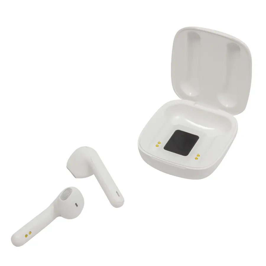 5,5 cm x 5 cm x 2,5 cm. (medida de la caja) 45 mm (auriculares). Plástico ABS. Audifonos bluetooth con imán, se conectan al celular de forma inalámbrica. Los audífonos cuentan con función touch en cada costado de los audifonos (izquierdo y derecho) para funciones de encendido, apagado, avance, retroceso, reproducción y pausar musica. Así como también para las funciones de responder, rechazar o finalizar una llamada. Estuche que permite cargar la batería de los auriculares. Indicador de batería del estuche. Base de carga 300 MAH . Audifonos: 30mAh Bluetooth V5.0. Rango de alcance 10 metros. Tiempo de reproduccion autónomo 3 horas aprox. Tiempo de carga de la batería 1 hora. Cable de carga USB tipo C. Duración de la batería en modo stand by: 40 hs. Presentación en caja de regalo.