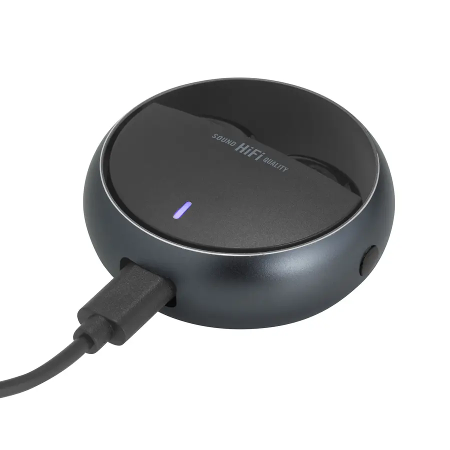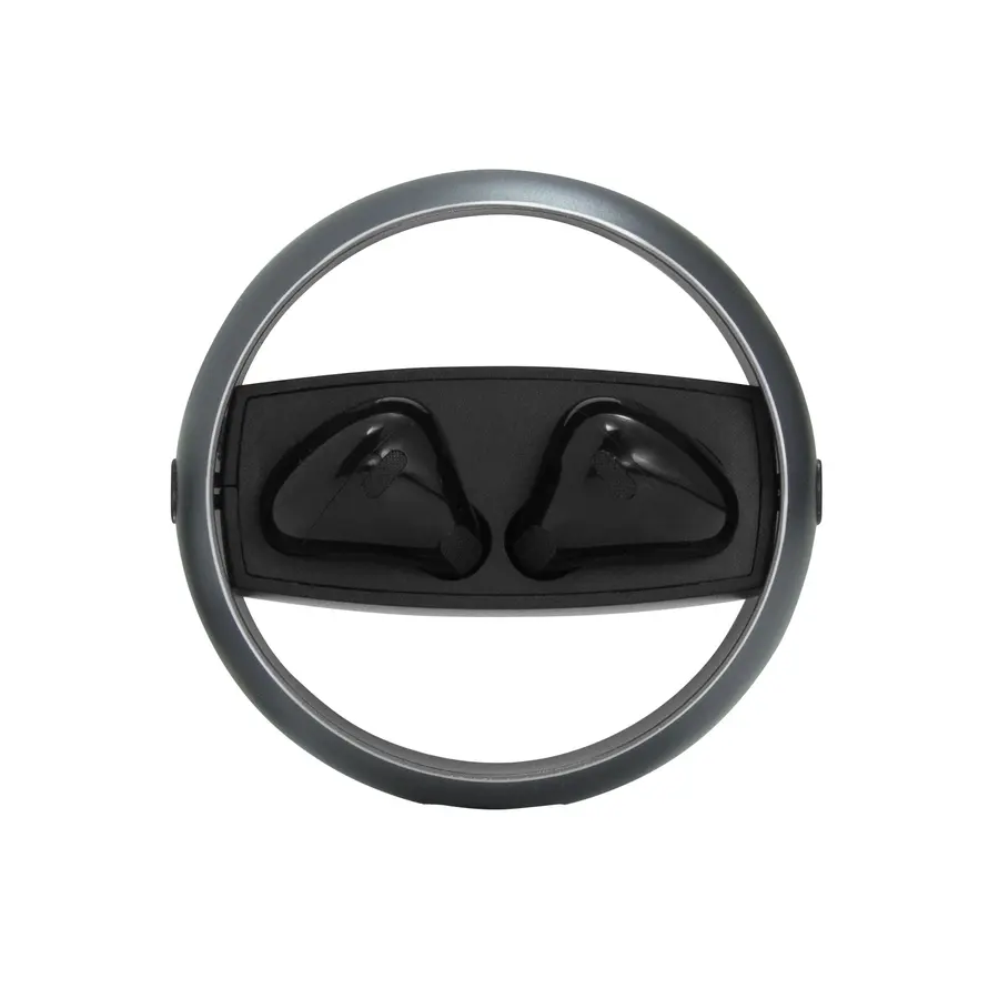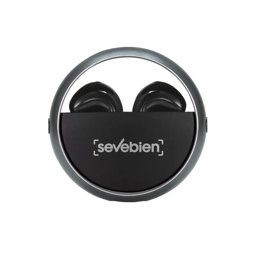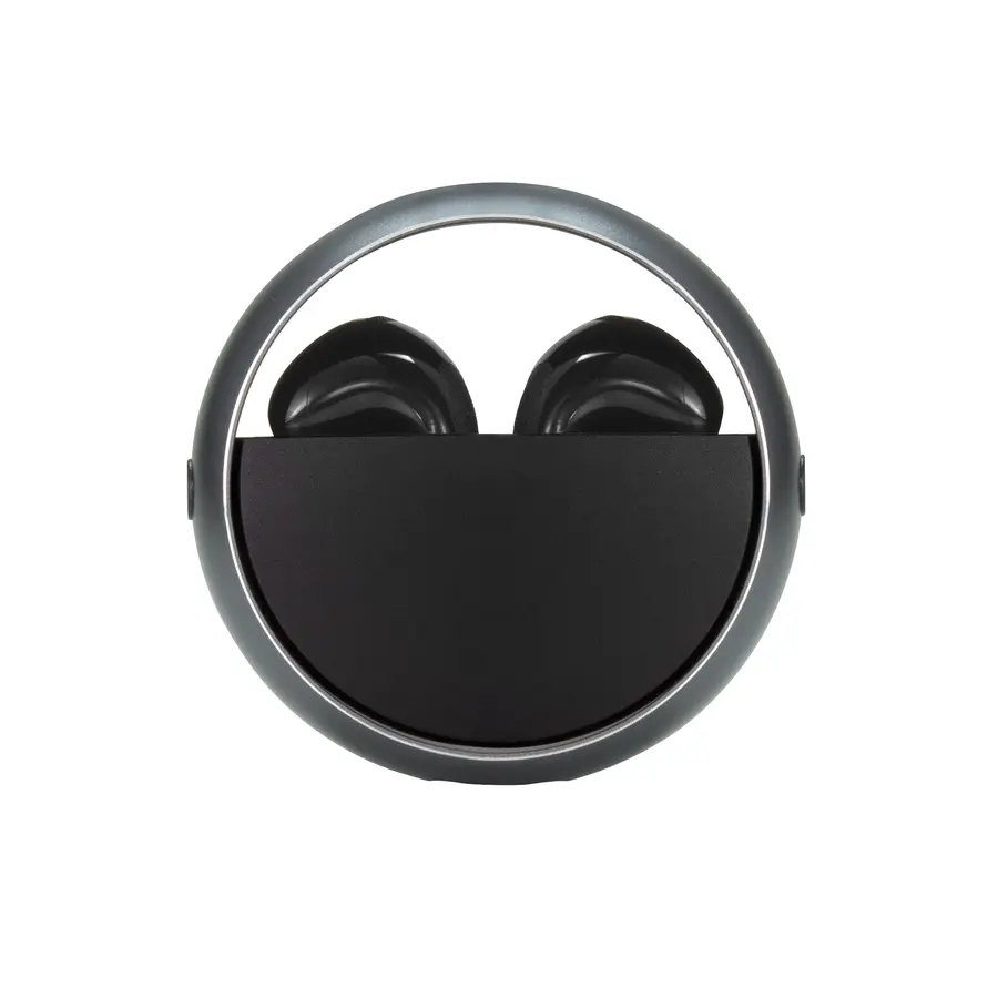 Plástico ABS. Aluminio. Auriculares TWS color negro. Sonido de calidad HI-FI. Versión Bluetooth V5.3. Rango de alcance 10 metros (en áerea abierta). Tiempo de reproducción 4 horas. Capacidad de la bateria: 25 mAh para los auriculares, 230 mAh para el estuche de carga. Los auriculares se colocan en el estuche de carga con marco de aluminio giratorio. Accesorios: cable de carga USB tipo C en color negro. Incluye manual de usuario. Presentación en caja de regalo color negro mate.