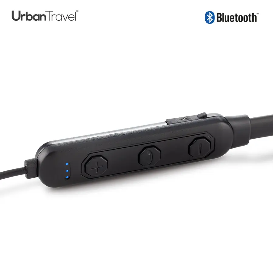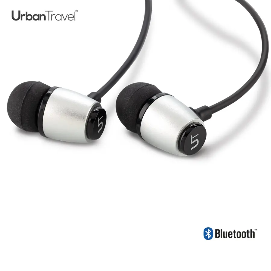 Audífonos intraauriculares plásticos Bluetooth. Fabricados en ABS, extremos magnéticos para llevarlos unidos cuando no se utilizan. Diadema para cuello.