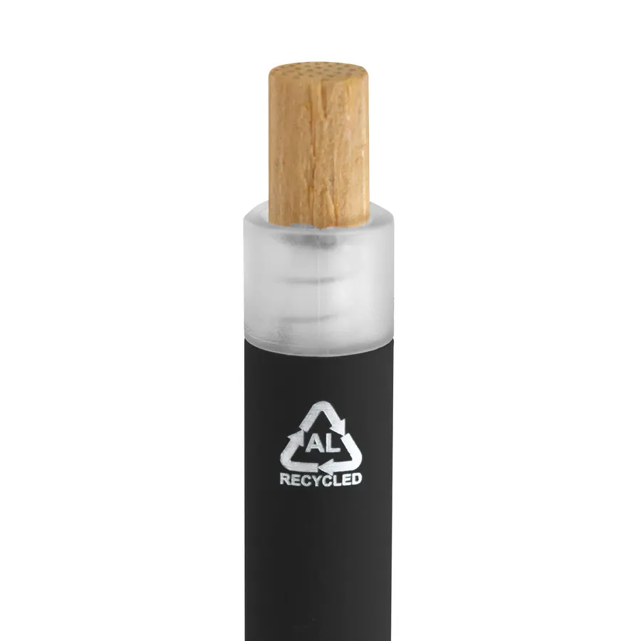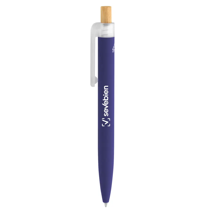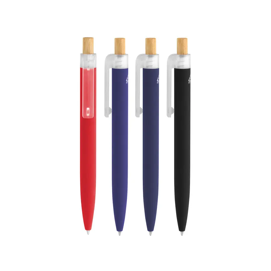 Fusiona lo moderno, elegante y ecológico.Bolígrafo retráctil. Cuerpo de alumio en diferentes colores acabado mate. Botón pulsador de bambú. Clip plástico transparente con terminación frosty. Medidas: 1,6 x 13,4 cm. Materiales: Aluminio reciclado, plástico RPET y bambú. Peso: 16,5 g. Tinta: negra.