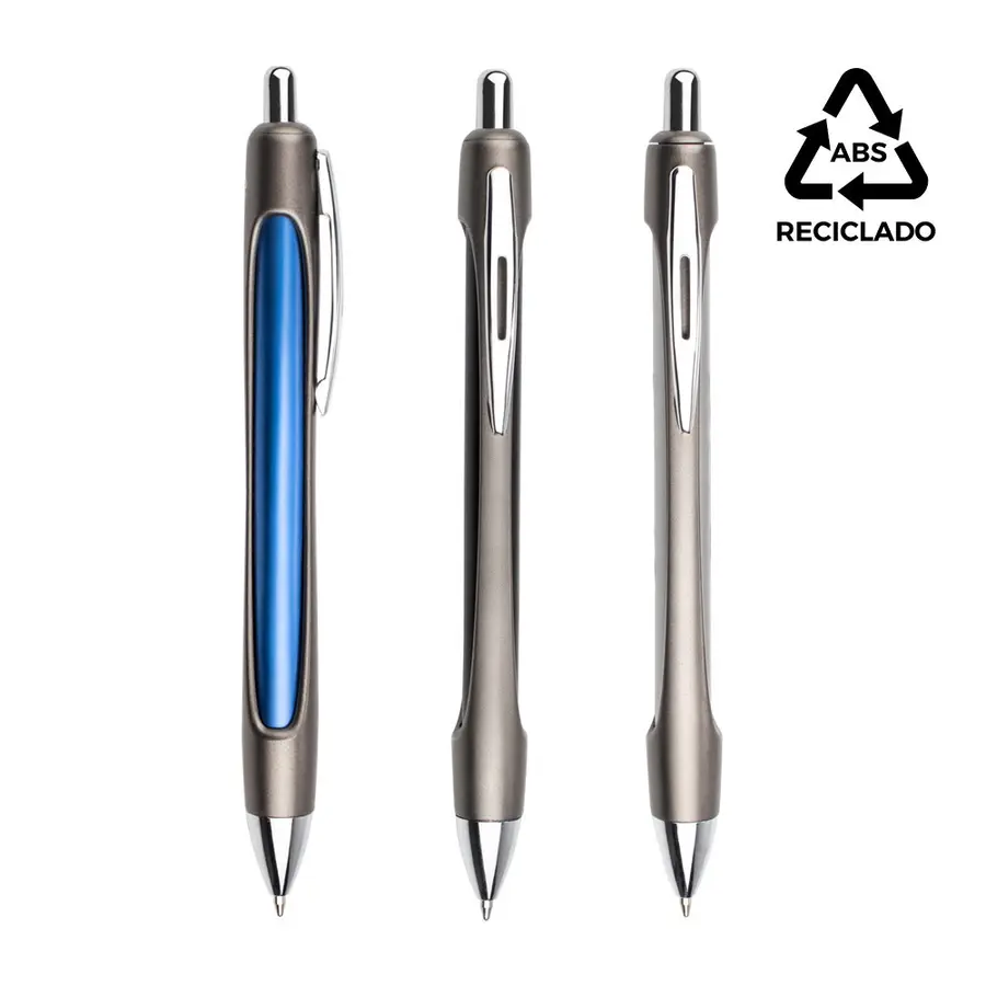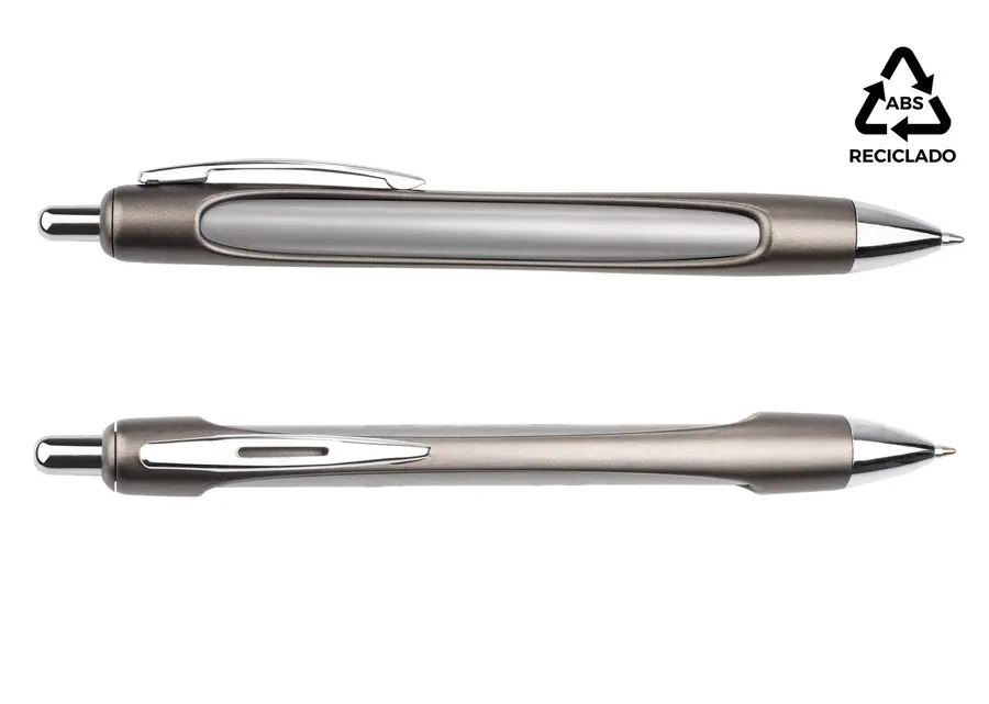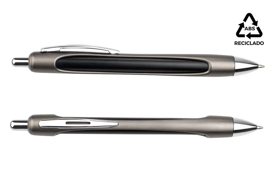 Bolígrafo de acción retráctil con diseño metálico y materiales reciclados. Cuerpo exterior en ABS reciclado con acabado metálico, interior de aluminio reciclado. Clip, botón y punta cromados. Incluye recambio tipo Parker de plástico. (Bolígrafo/Esfero)