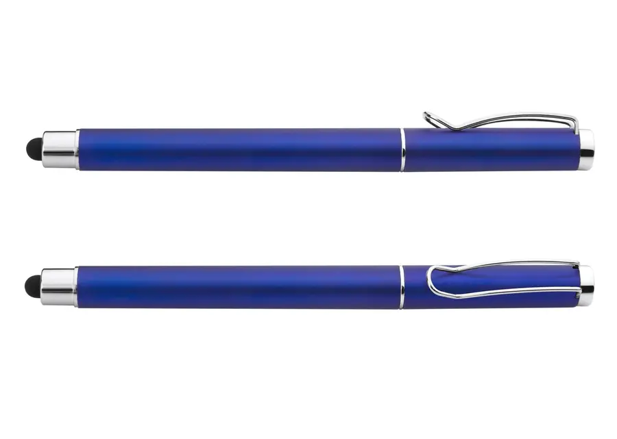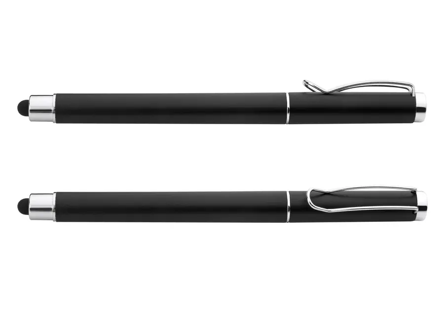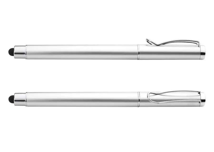 Bolígrafo con acabado mate, clip y punta plateada, con stylus en la parte superior y tapa.