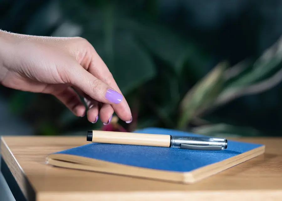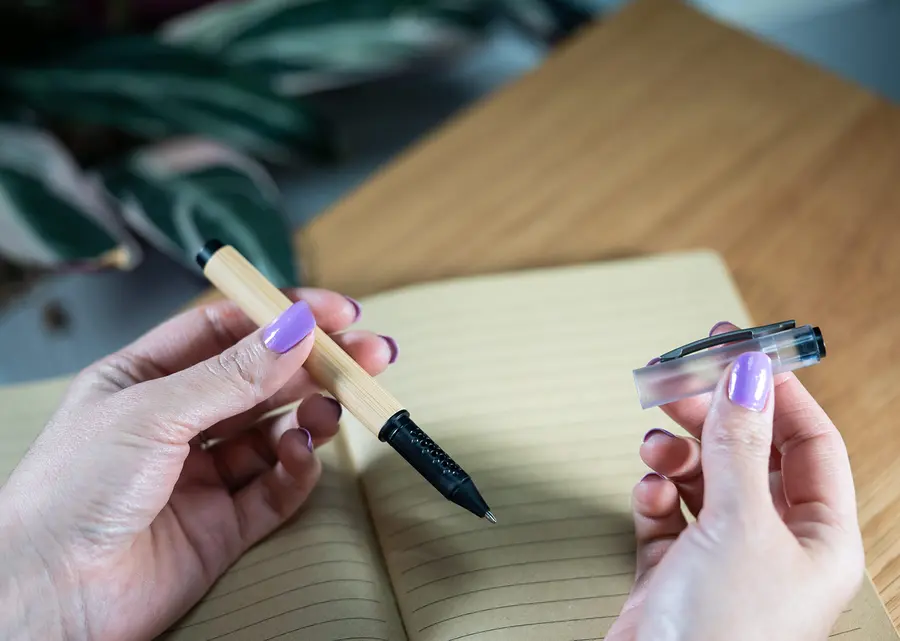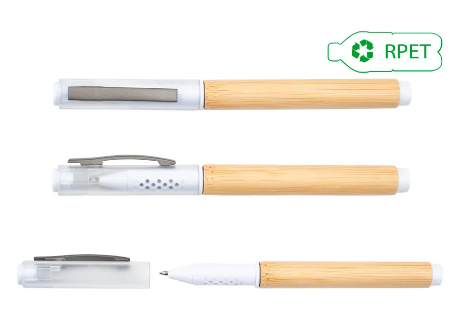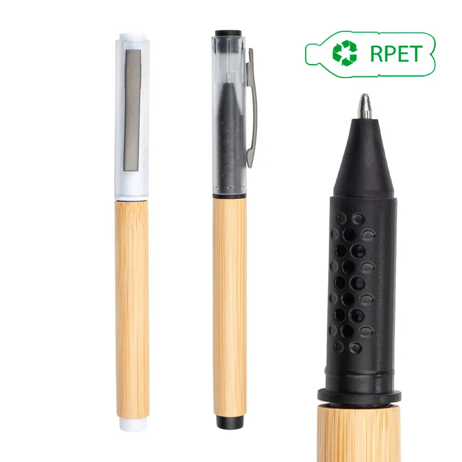 Bolígrafo con cuerpo de color sólido hecho en bambú, tapa transparente con clip metálico. Tinta de gel. Al retirar la tapa, el bolígrafo cuenta con detalles circulares. (Bolígrafo/Esfero)