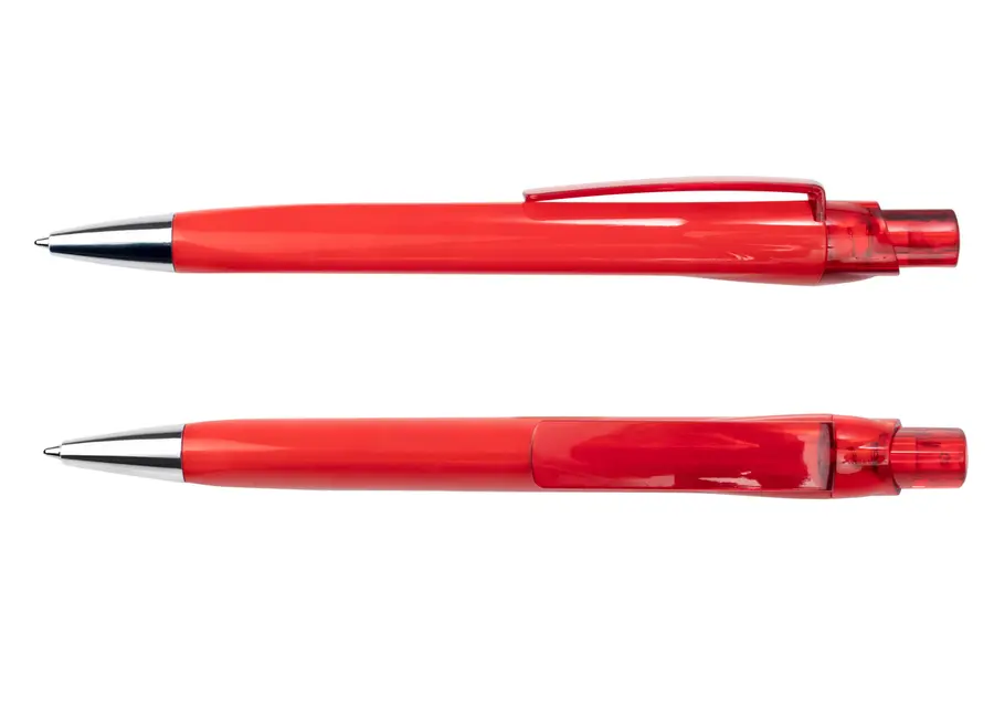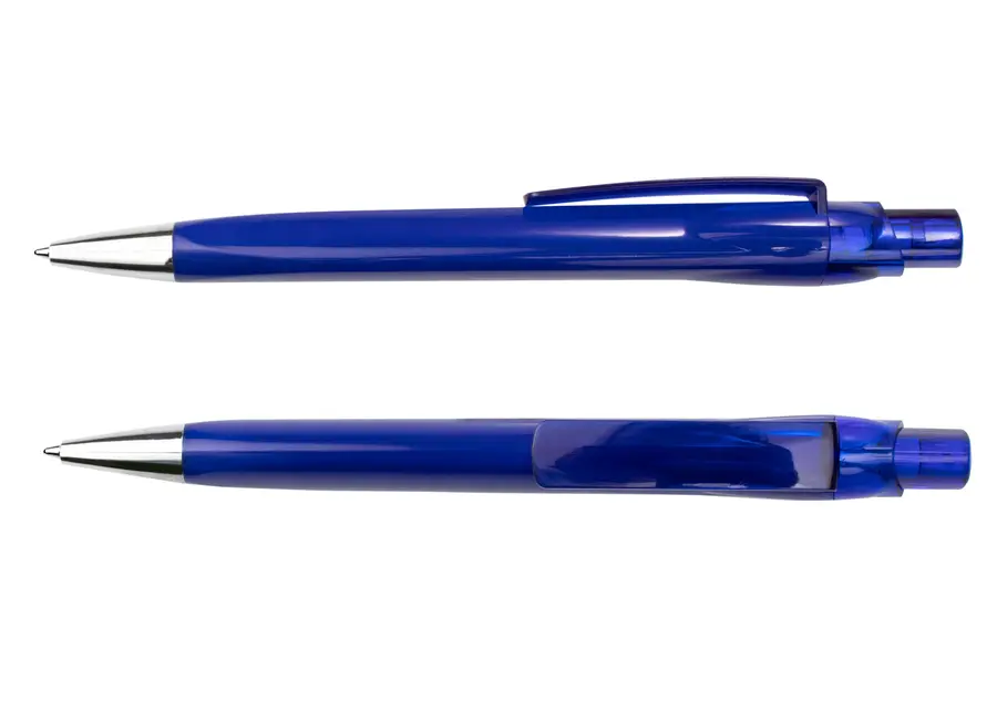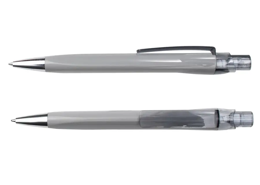 Bolígrafo con barril de color sólido, clip y empujador en acabado transparente, y punta cromada que aporta un toque moderno al diseño. Su estructura liviana y funcional lo hace ideal para uso diario en distintos entornos.