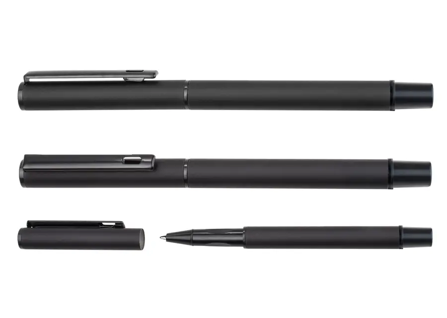 Bolígrafo con cuerpo de aluminio de color engomado con tapa, clip negro y adornos. (Bolígrafo/Esfero)