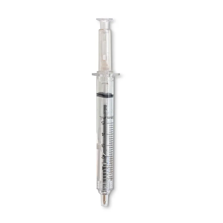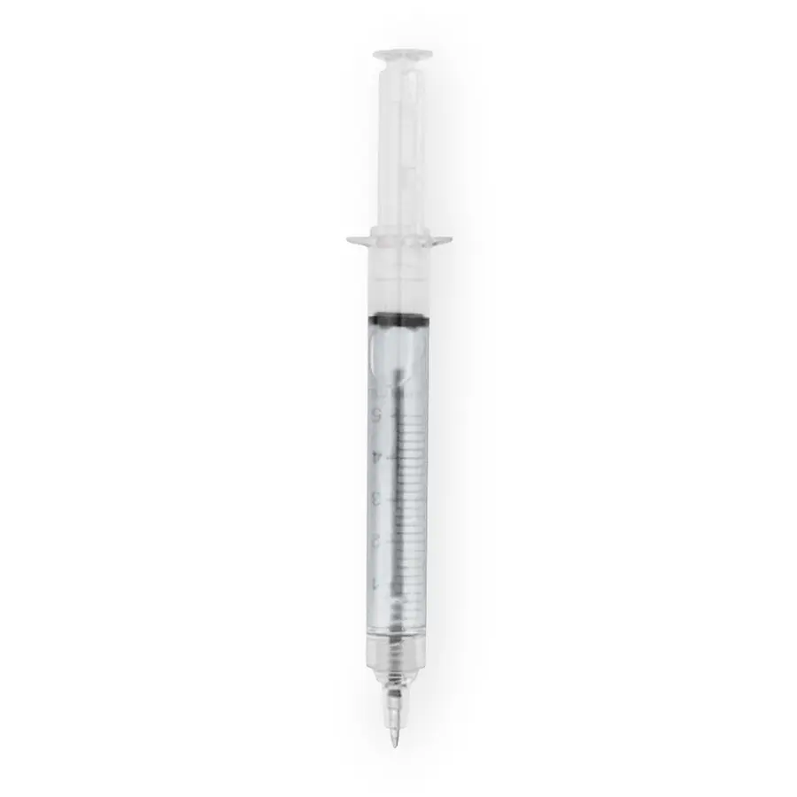 Bolígrafo plástico tipo jeringa. La tinta es color negro.