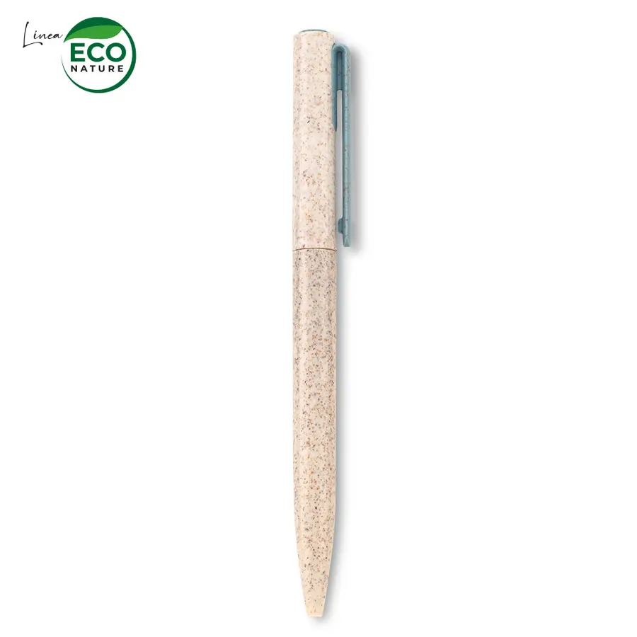 Bolígrafo plástico. Mezcla con material ecológico en fibra de trigo (50%-60% aprox). El porcentaje de material ecológico tiene un promedio de biodegradabilidad de 2-3 años después del fin de su vida útil. Mecanismo Twist.
