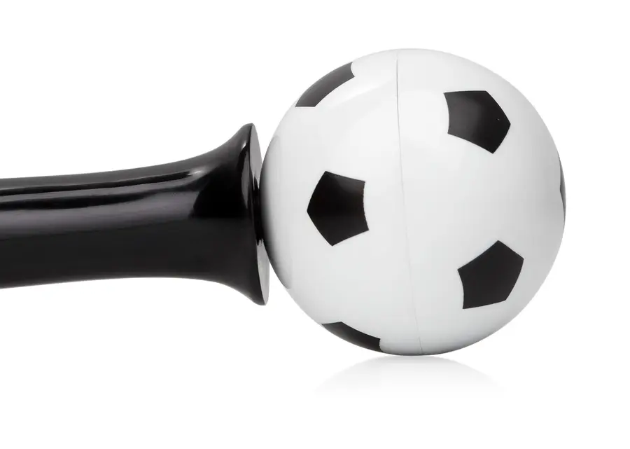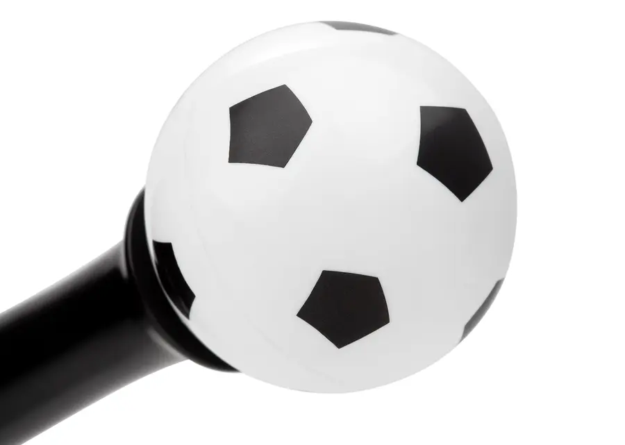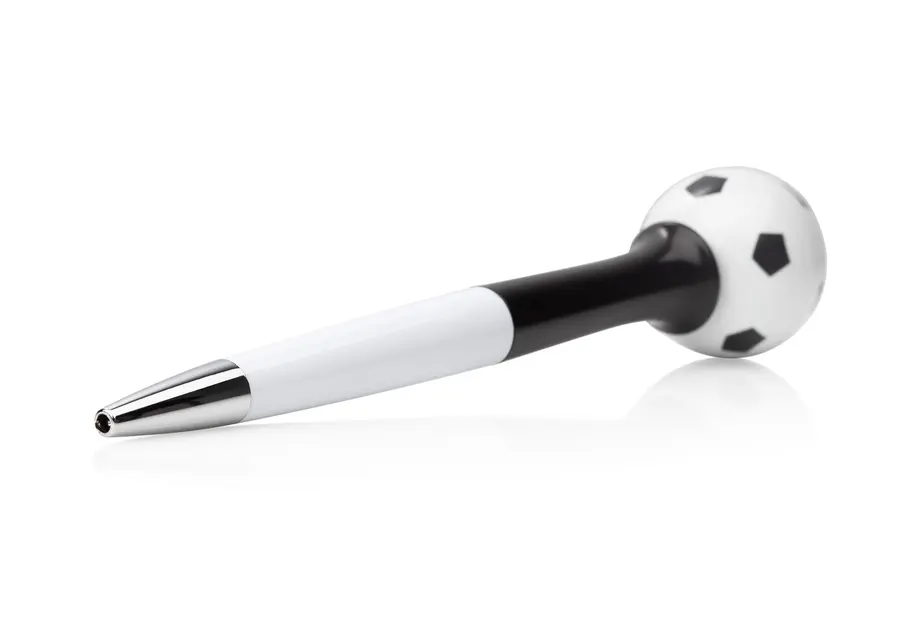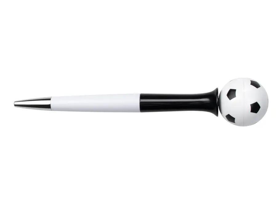 Bolígrafo de acción giratoria con barril de color sólido y punta cromada, ideal para los amantes del fútbol. Su diseño incluye una esfera decorativa con impresión de balón en la parte superior, que gira suavemente para añadir un toque divertido y dinámico mientras escribes.