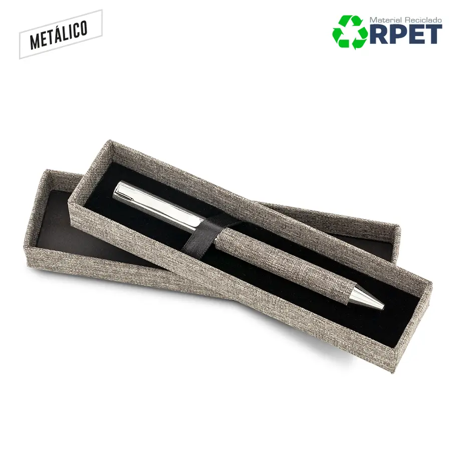 Bolígrafo metálico con grip en poliéster RPET. Estuche de cartón forrado con poliéster RPET. Mecanismo Twist.