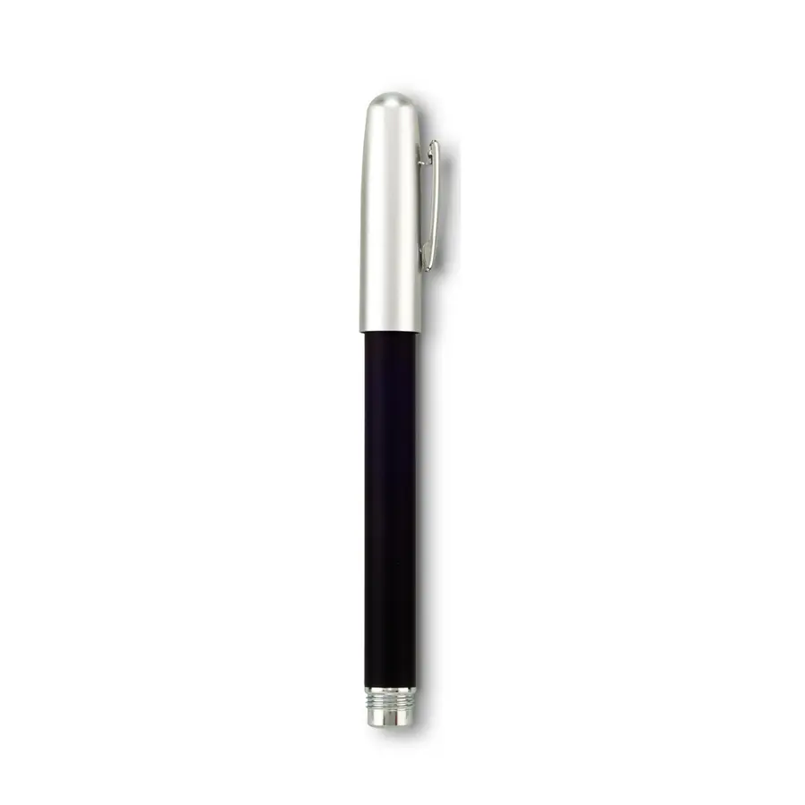 Bolígrafo roller metálico, con terminado de silicona en el barril. Mecanismo de rosca en la tapa.