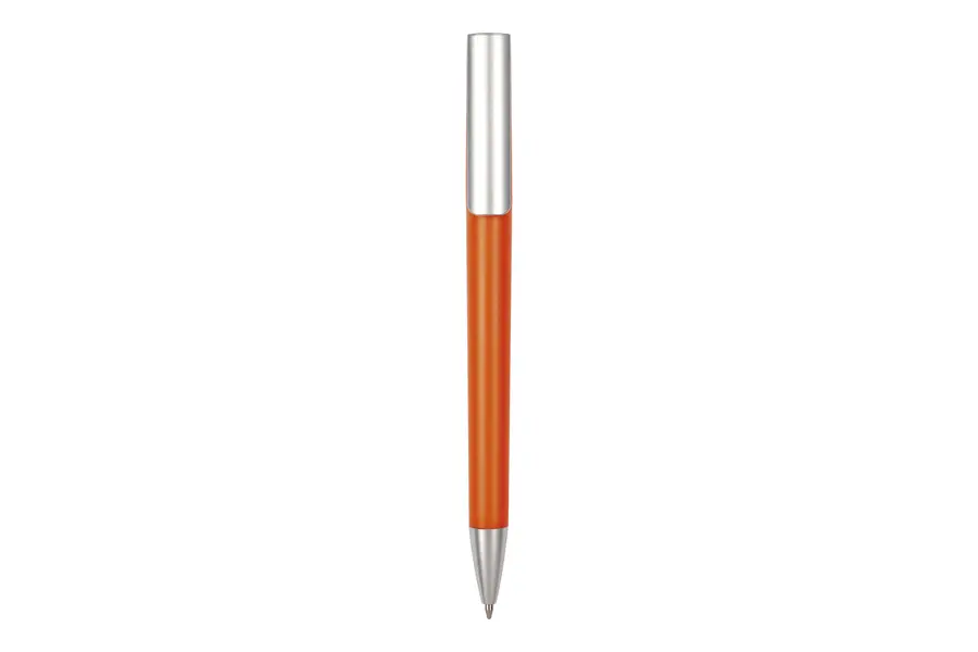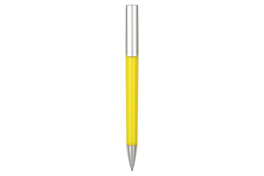 Ø 0,5 x 13,5 cm. Bolígrafo plástico . Cuerpo de color. Detalles de color plata en clip y puntera. Apertura giratoria. Tinta negra.