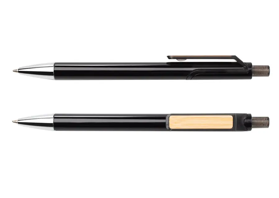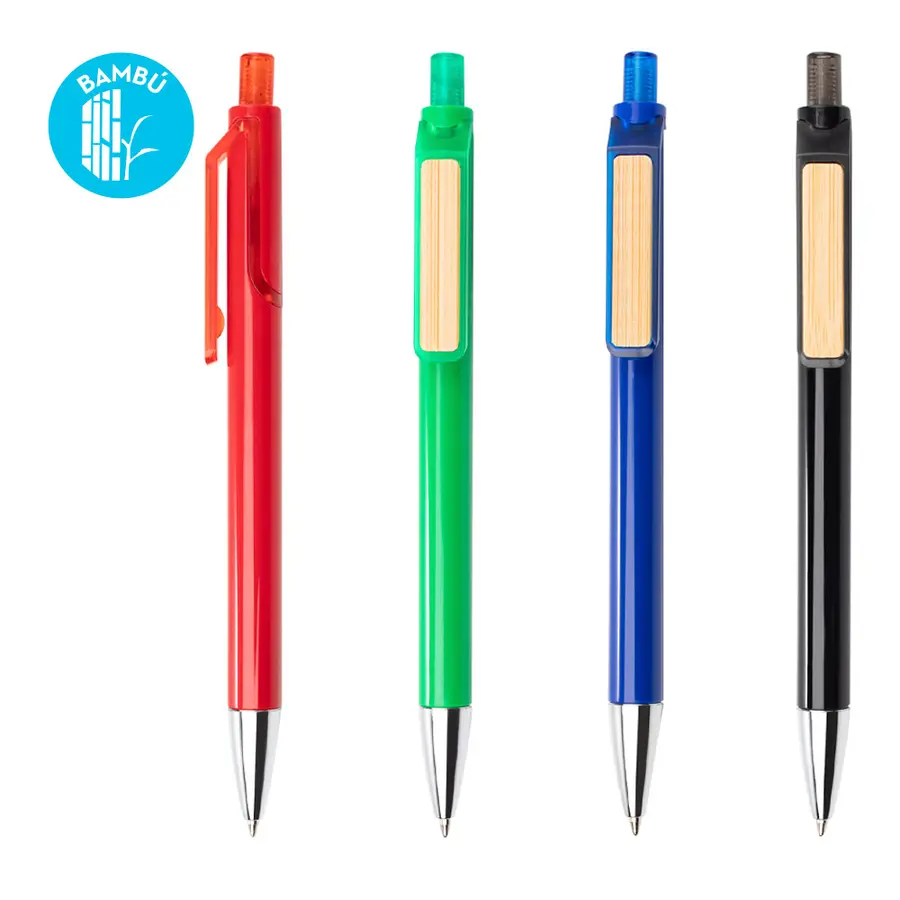 Bolígrafo de plástico con sistema retráctil y clip de bambú que puede ser usado como espacio de marca.