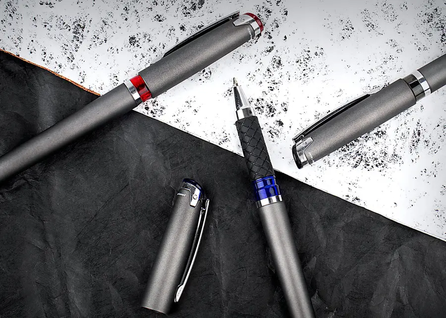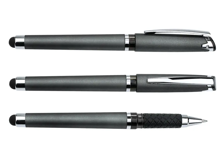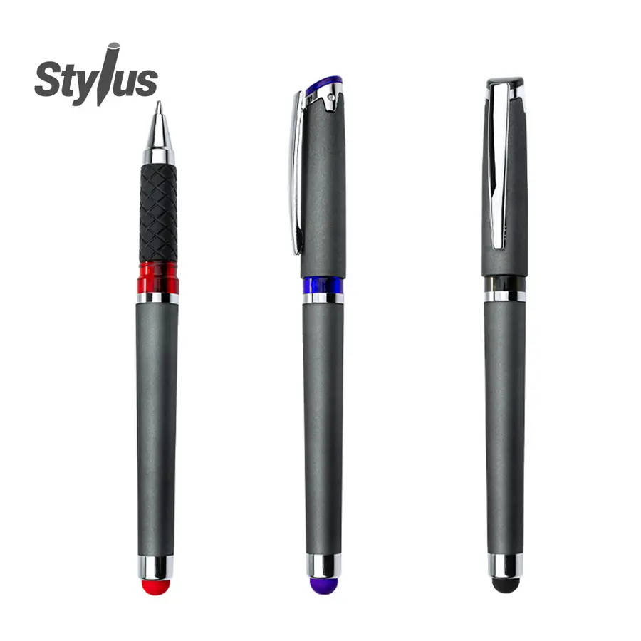 Bolígrafo con tapa y touch para dispositivos con pantallas táctiles, grip de caucho para fácil agarre y mina tipo Gel, clip metálico, al momento de la fabricación utiliza técnica de pintura Water Based