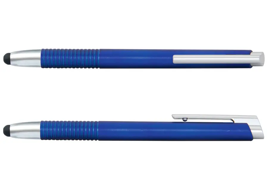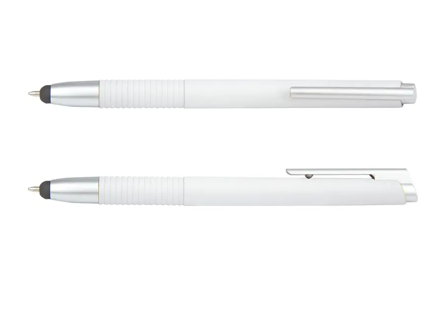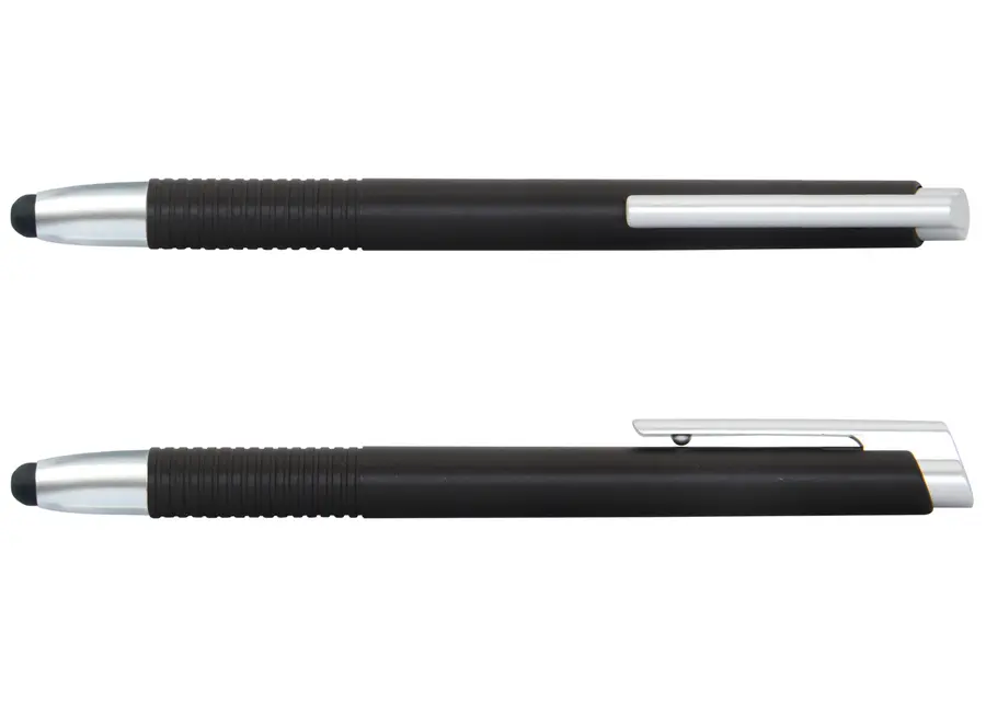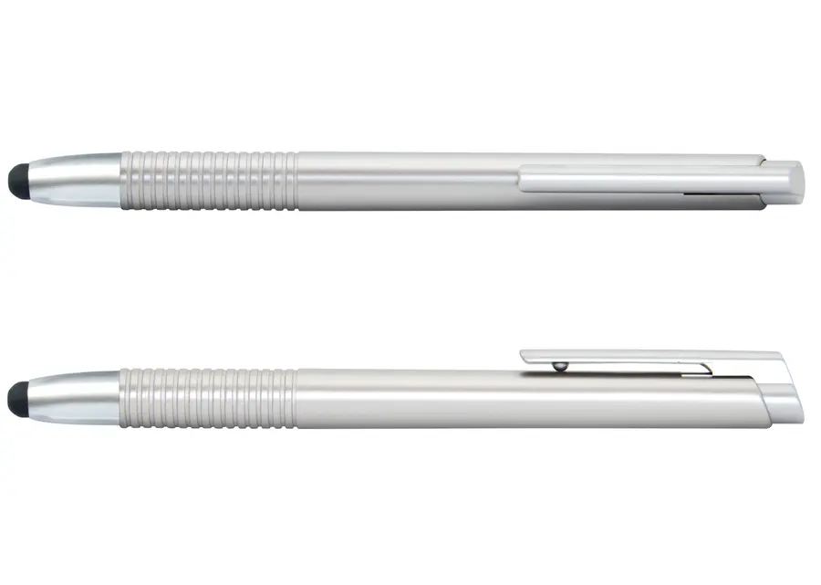 Bolígrafo retráctil con acabado mate, clip y punta plateados, stylus en la punta para dispositivos de pantalla táctil.