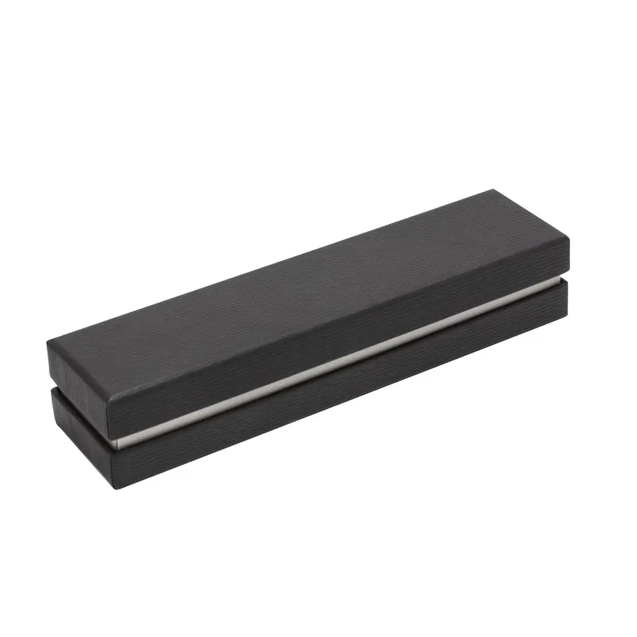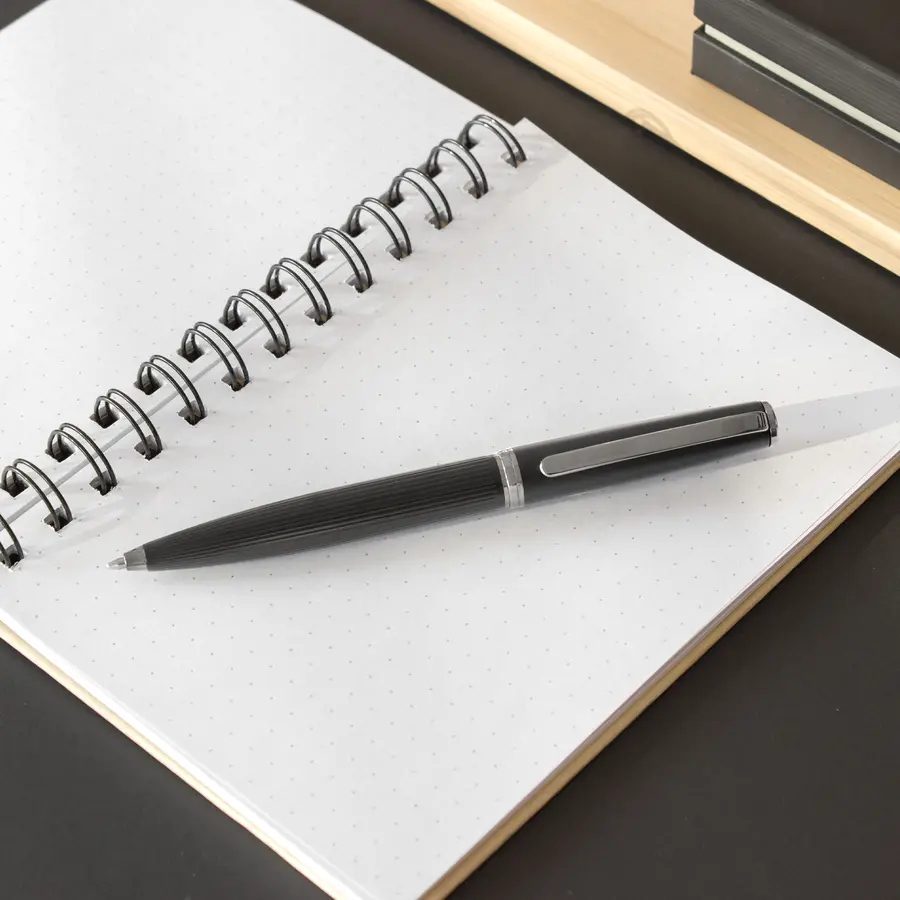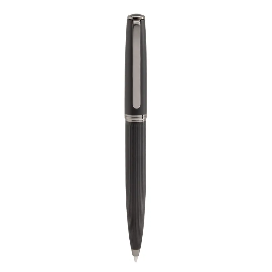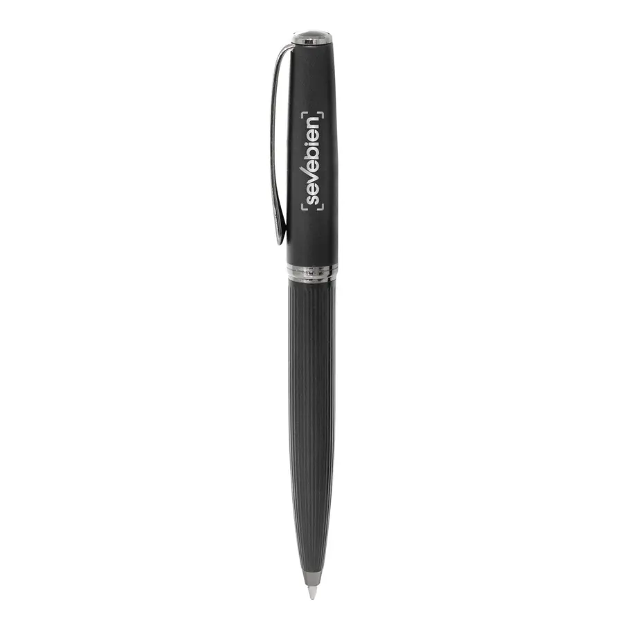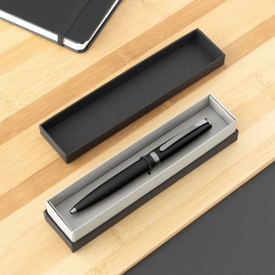 Metálico. Cuerpo color negro mate. Puntera, clip y anillo metálico. Apertura giratoria. En la parte superior destape electroplateado. Parte inferior texturada para mejor agarre. Tinta negra. Recarga metálica. Presentación en caja de regalo.