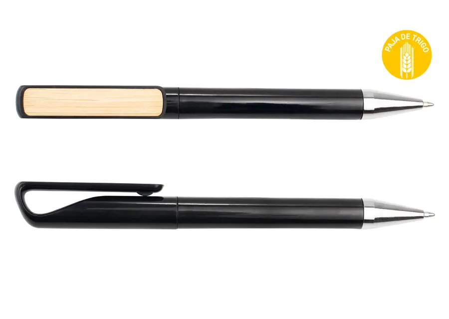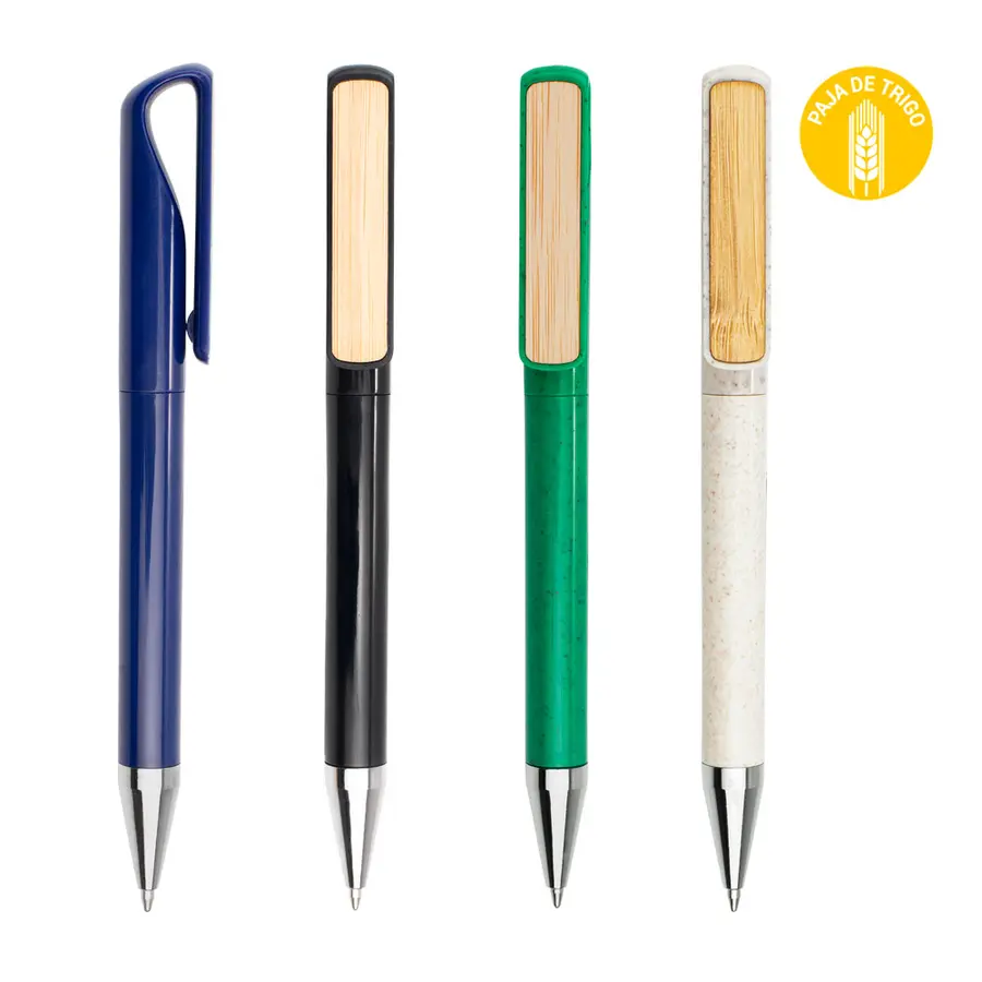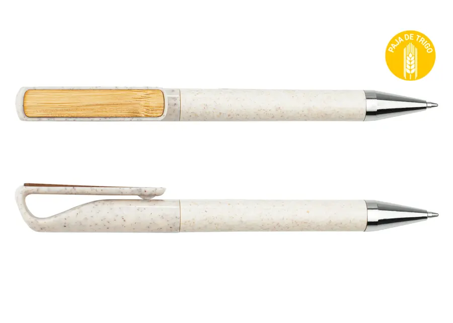 Bolígrafo hecho con paja de trigo coloreada, clip de bambú y detalles cromados. Sistema de apertura de giro. (Bolígrafo/Esfero)
