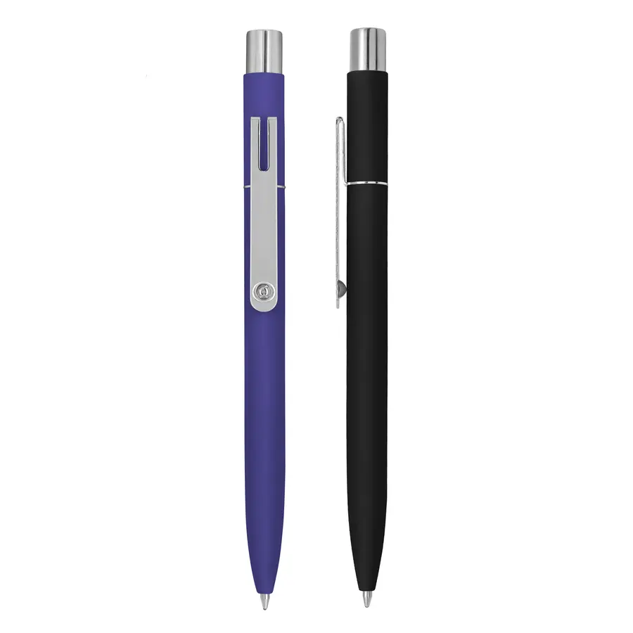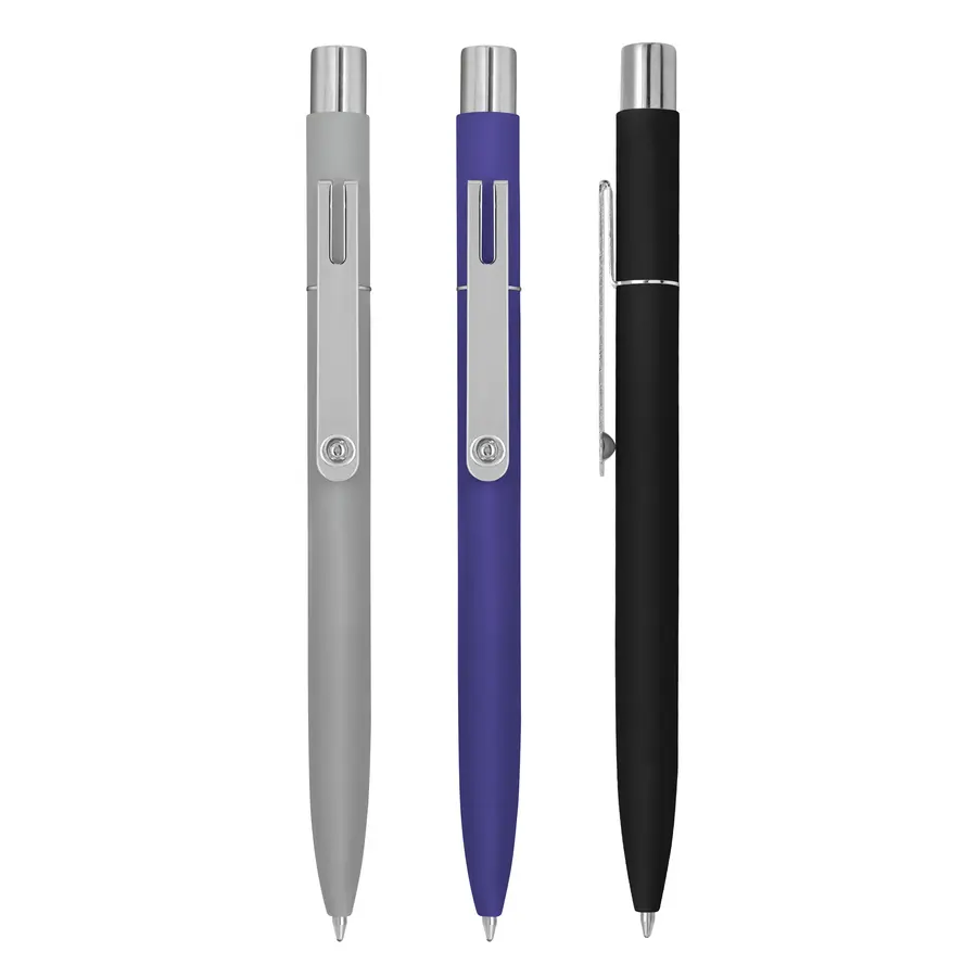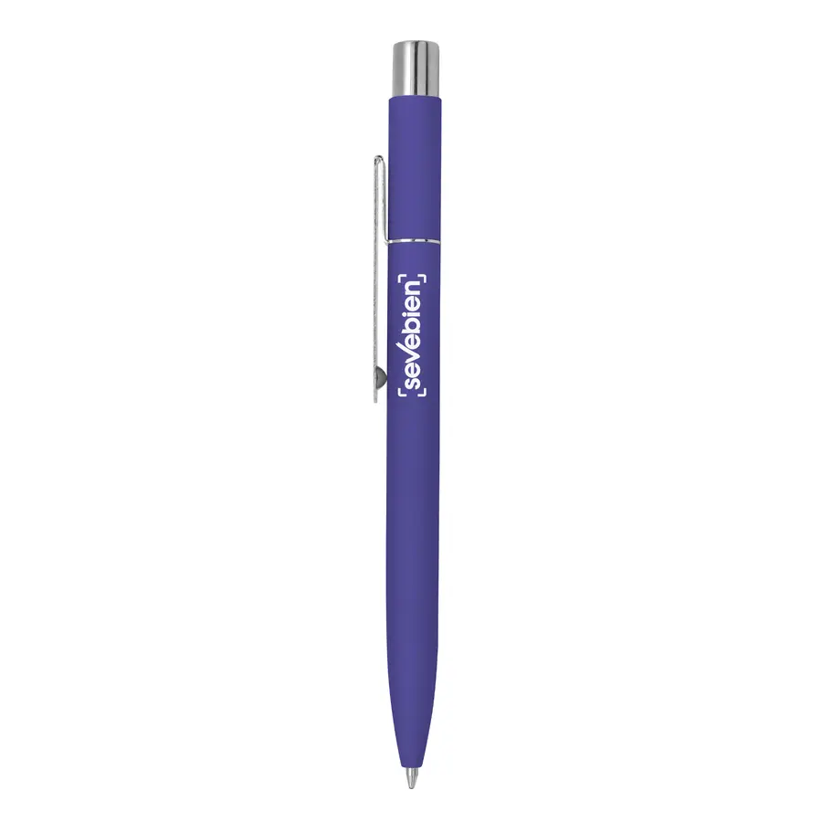 Metal. Cuerpo de aluminio, acabado engomado en diferentes colores, muy suave al tacto. Bolígrafo retráctil. Clip, pulsador y anillo metálicos color plata. Tinta negra. Destape al grabar color plata.