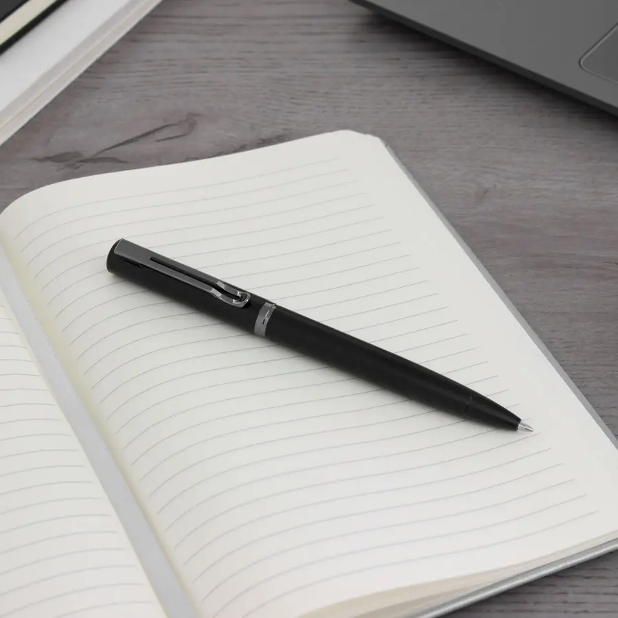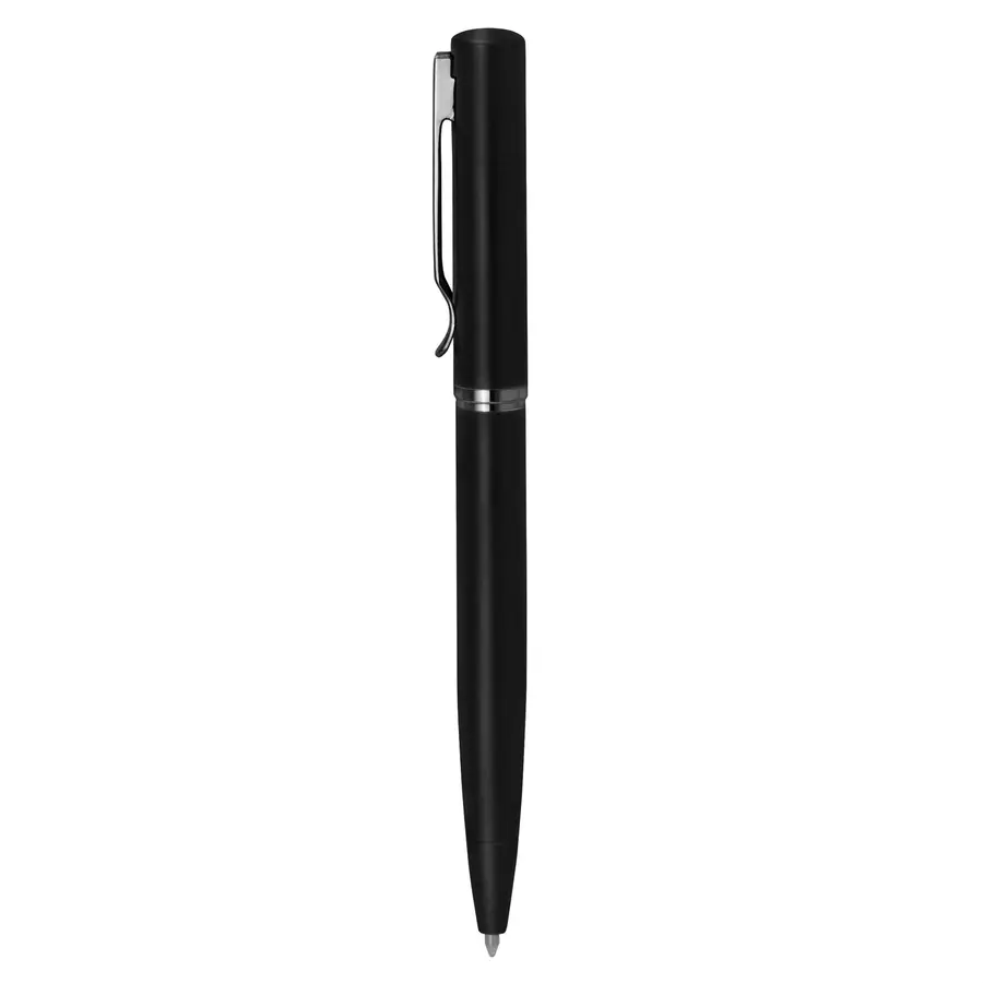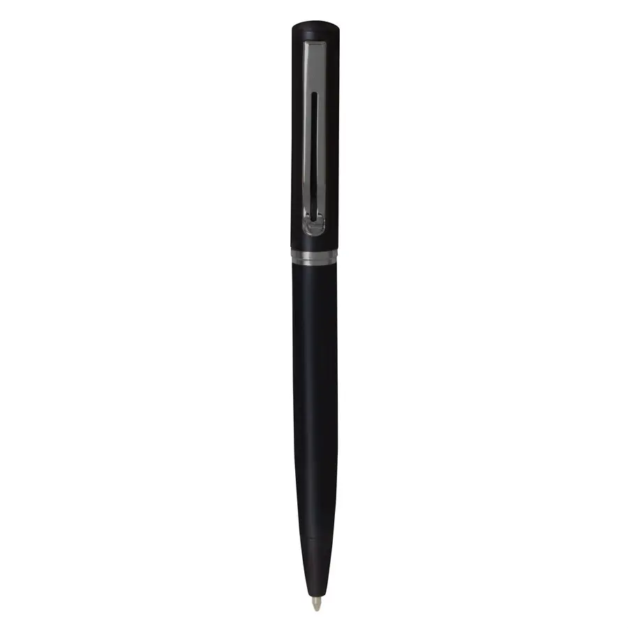 Estilo moderno.Bolígrafo con apertura giratoria. Cuerpo metálico en negro mate. Parte superior de hierro y parte inferior de acero inoxidable. Recarga Parker metálico. Clip y anillos metálicos color gun. Medidas: 13,5 cm. Materiales: Metal. Peso: 30 g. Tinta: negra. Presentación: en caja de regalo negra.