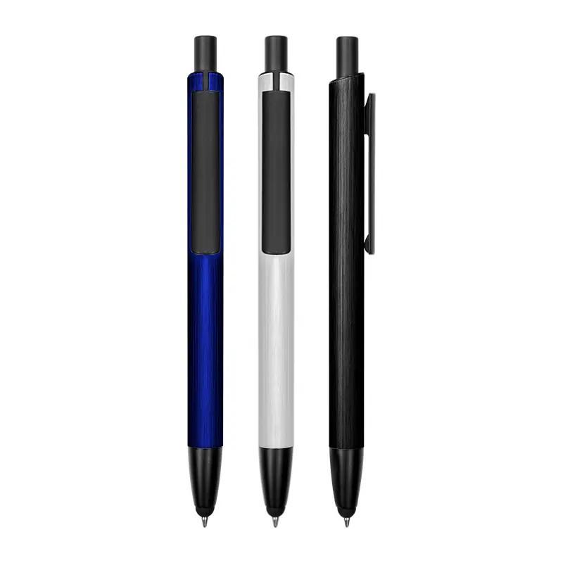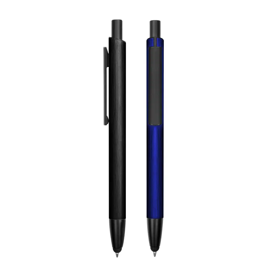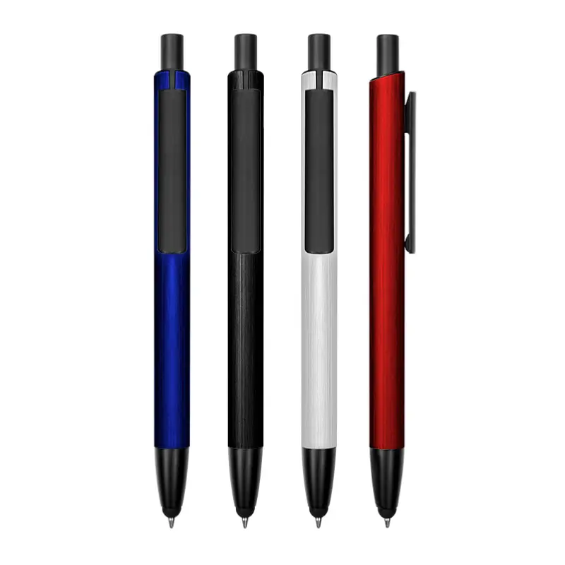 Aluminio. Cuerpo metálico. Clip, puntera y pulsador plástico. Puntera touch.