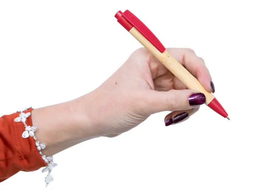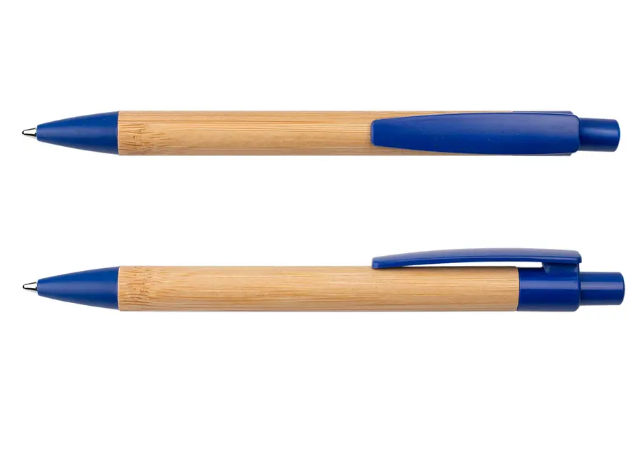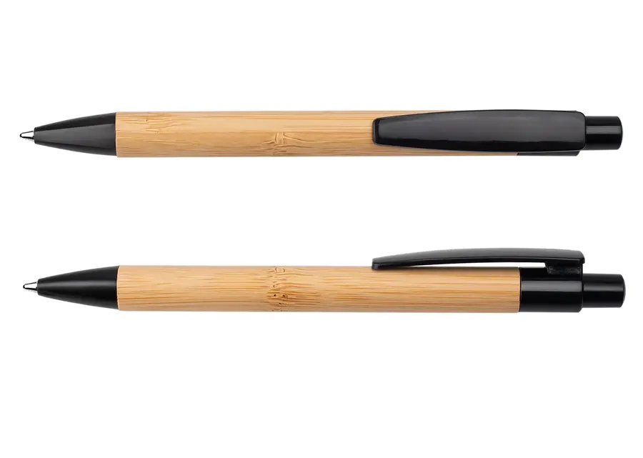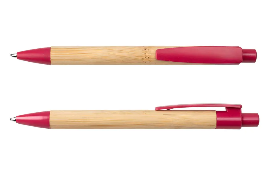 Bolígrafo retráctil con barril de bambú y detalles en paja de trigo de color en el clip, botón y punta, elaborado con materiales reciclados para un diseño sostenible y moderno. Ideal para quienes buscan funcionalidad y compromiso con el medio ambiente, disponible en atractivos tonos que aportan un toque natural y elegante.