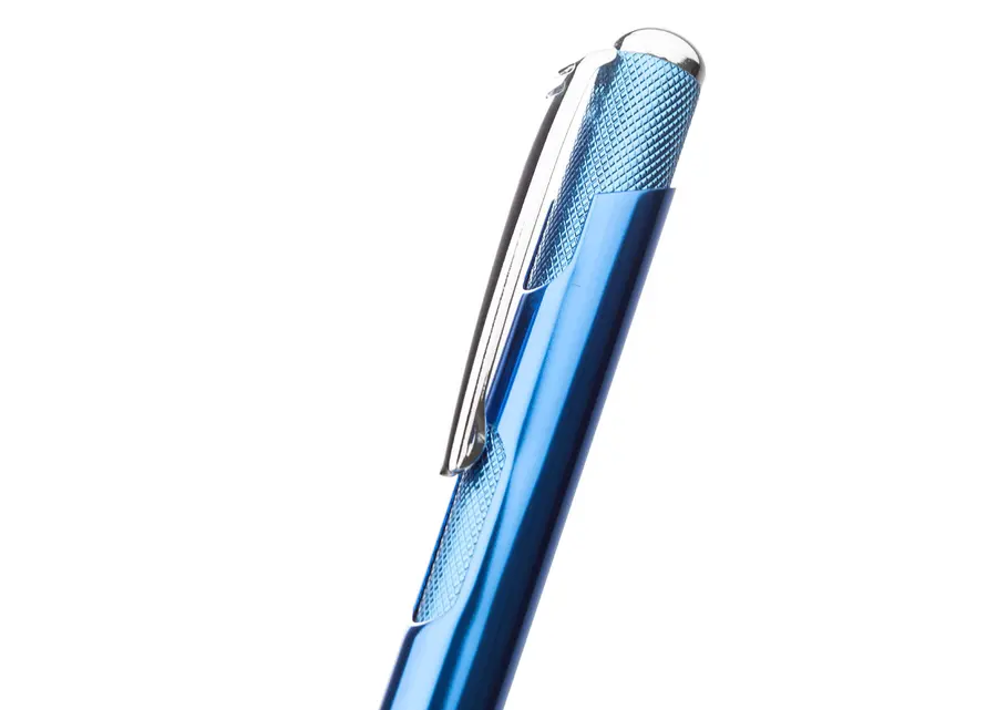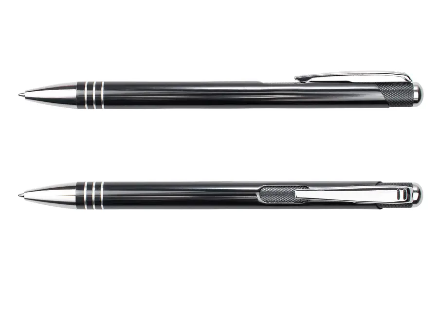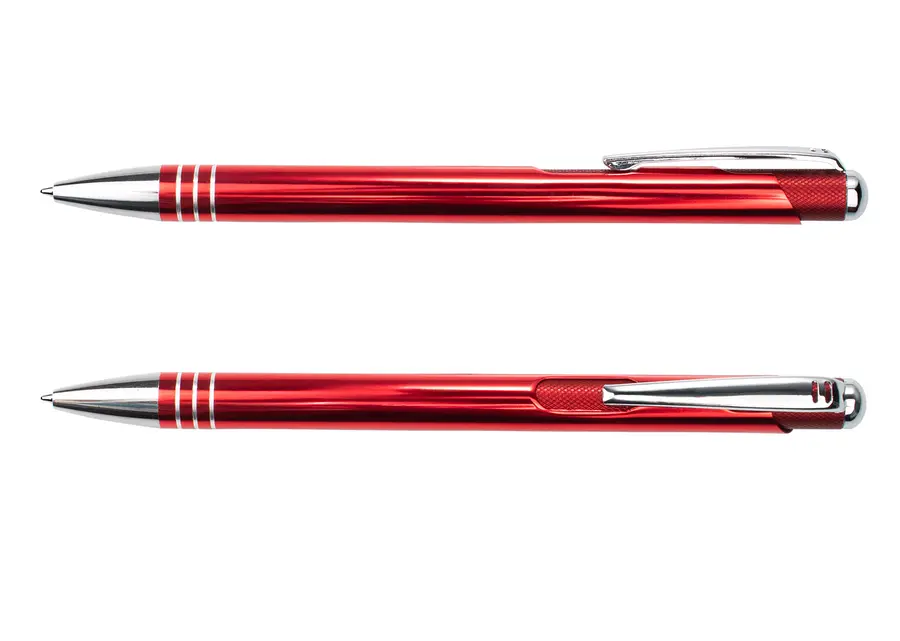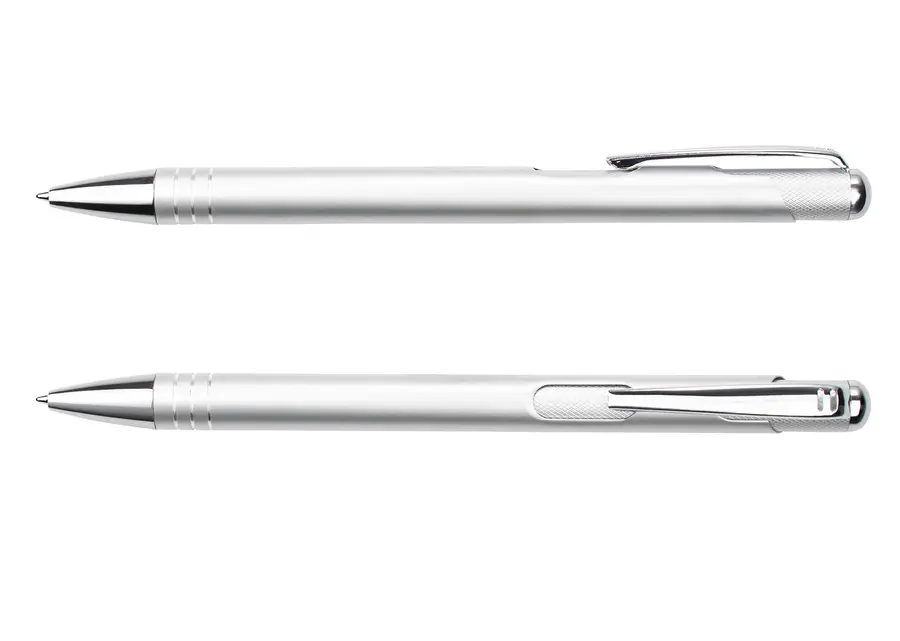 Bolígrafo retráctil con cuerpo de aluminio brillante, complementado con clip y detalles metálicos que aportan un acabado elegante y profesional. Su mecanismo retráctil ofrece practicidad y estilo en cada uso, ideal para quienes buscan funcionalidad sin renunciar al diseño.