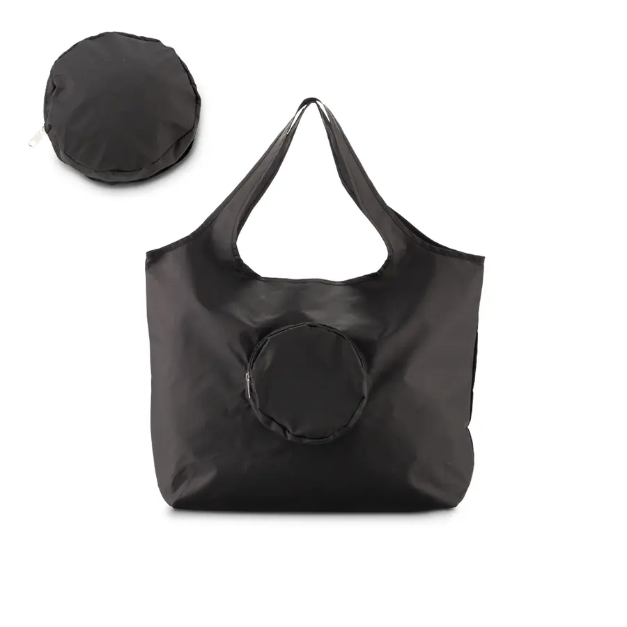 Bolsa compacta en poliéster. Incluye un bolsillo externo con cremallera el cuál funciona como estuche para la bolsa.