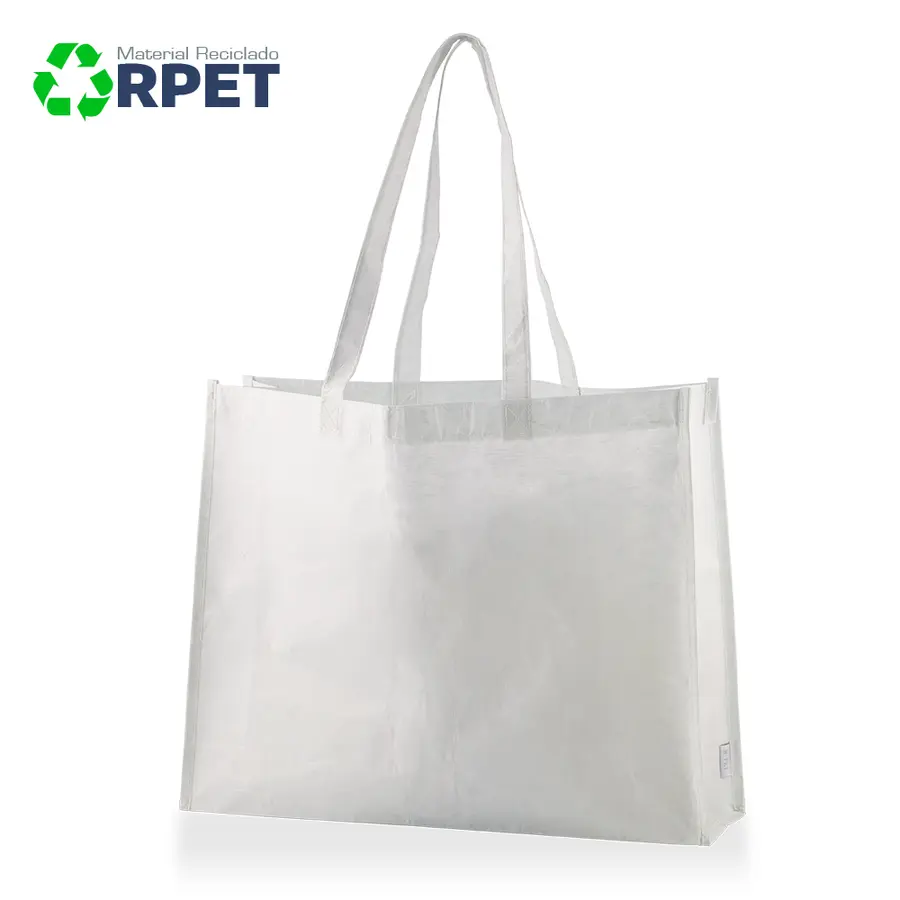 Bolsa fabricada 100% RPET (PET reciclado de botellas de agua) y manijas largas, laminado mate. Con costuras de refuerzo en X en las manijas. 100% ecológica.