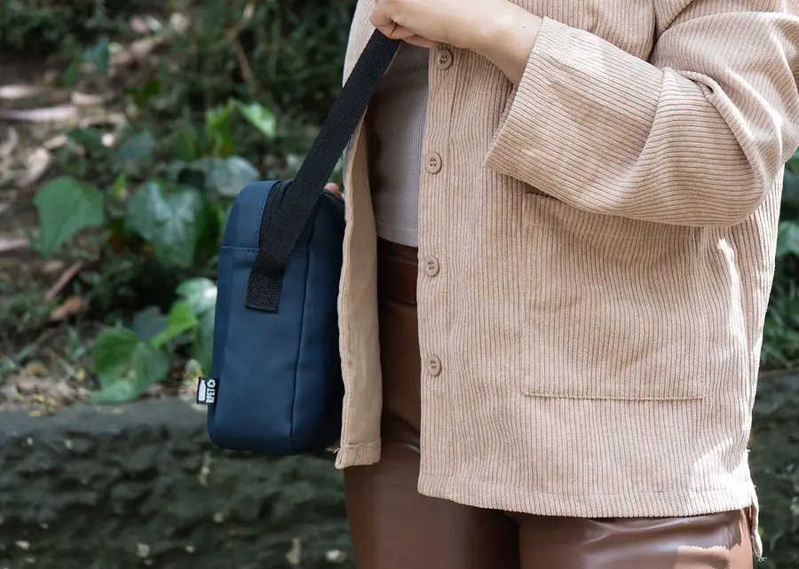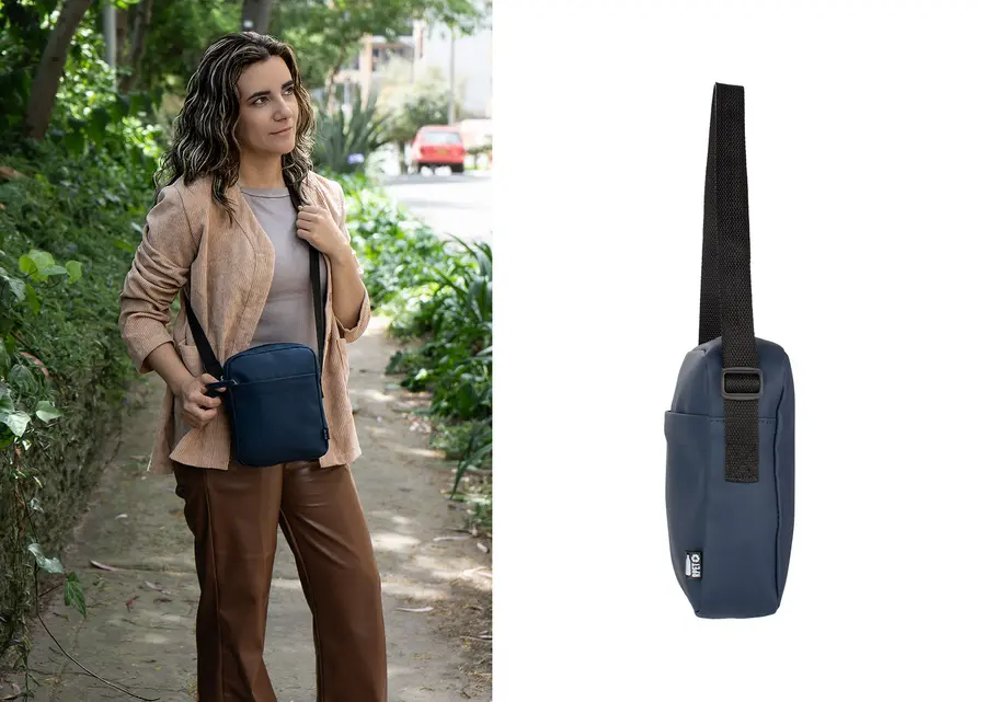 Bolso porta documentos de poliuretano con dos compartimentos con cierres de cremallera. Cargadera de tela ajustable.