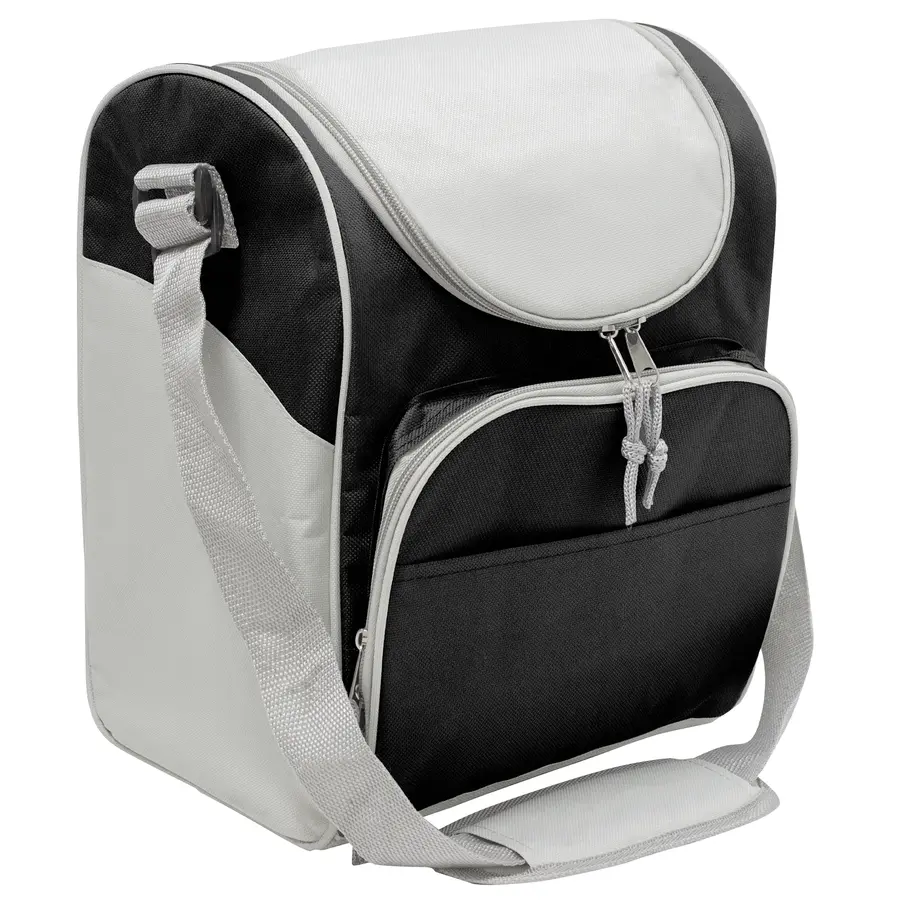 34 x 25 x 19 cm. Capacidad 16l. Polyester 600D. Bolso térmico. Interior totalmente recubierto de aluminio. Bolsillo frontal, correa extensible y cierres metálicos con tira cierres de cordón.