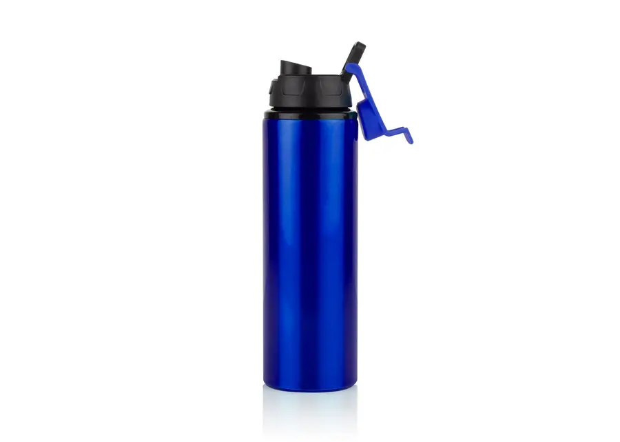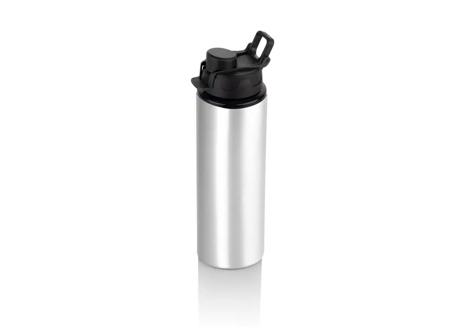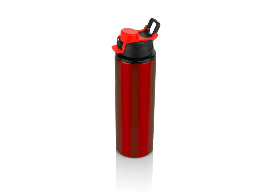 Botella en aluminio con tapa rosca plástica con boquilla y cubierta, manija plástica incorporada para transporte. Capacidad 730ml. Peso: 120g.