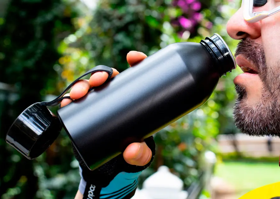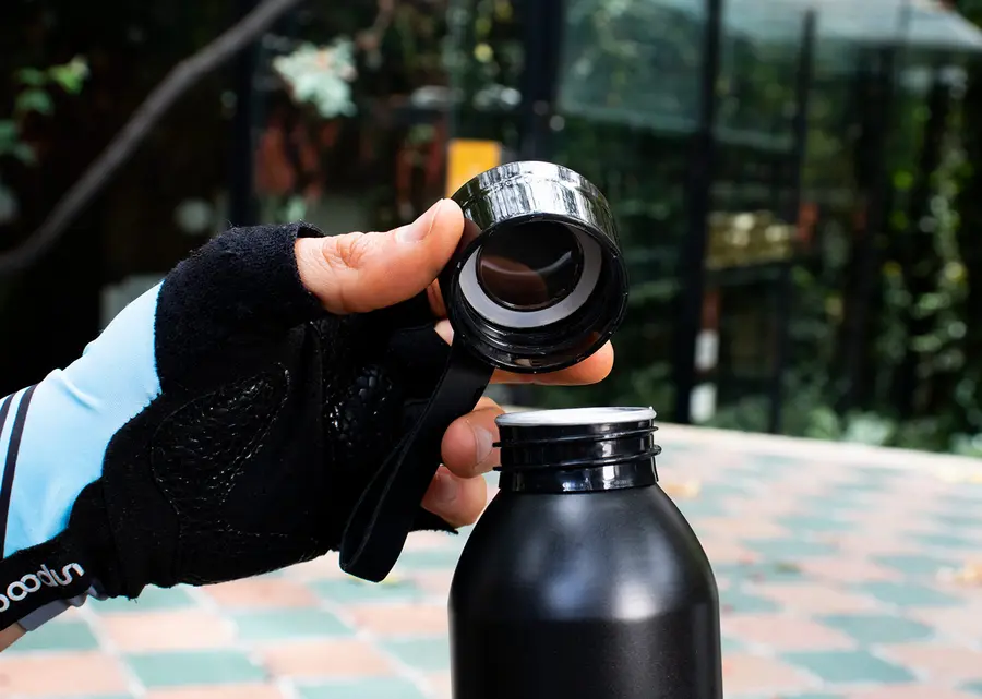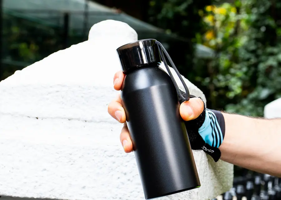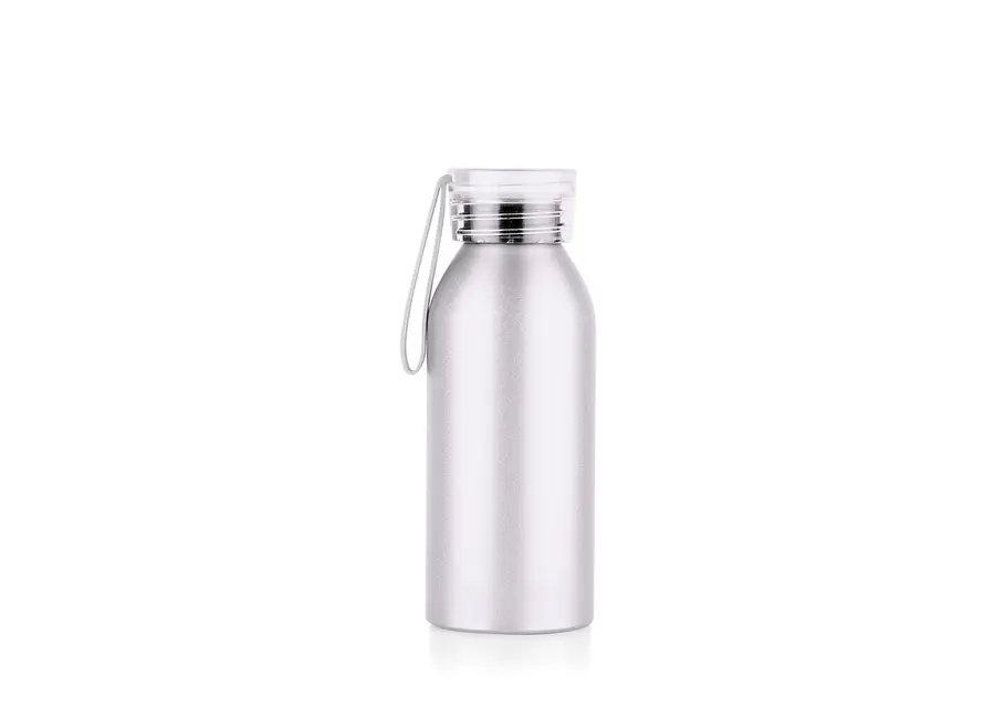 Botella en Aluminio, tapa rosca con correa en goma. Capacidad: 450ml.