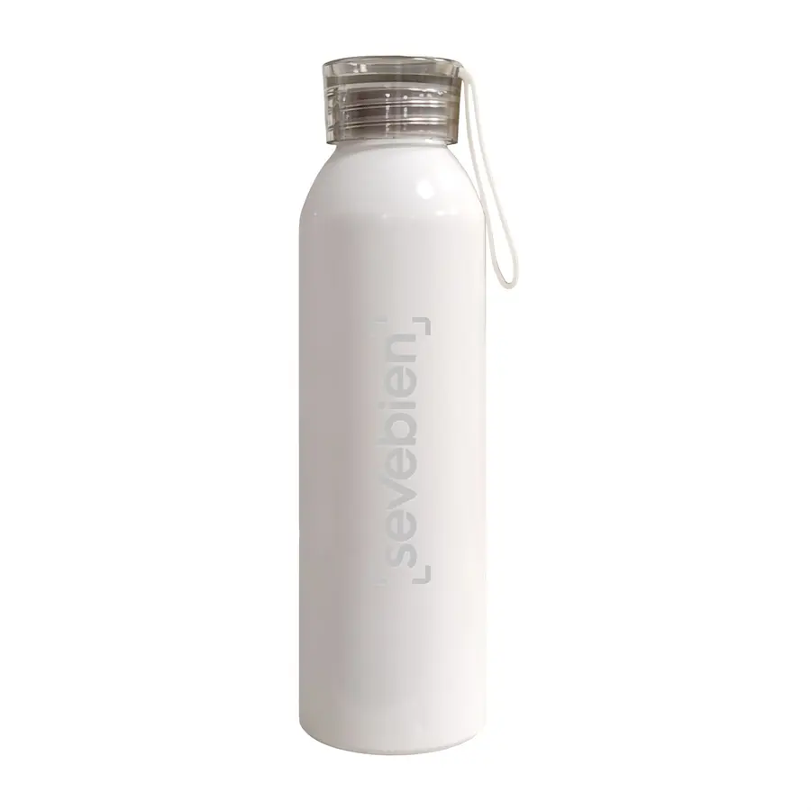 Ø 6,6 x 23,2 cm. Capacidad 600 ml. Aluminio. Botella de aluminio con cuerpo color. Tapa transparente con tira de silicona (de 8 cm) del mismo color que el cuerpo de la botella. Cuerpo de botella recubierto con pintura especial para facilitar la impresión del producto. Presentación en caja de regalo.