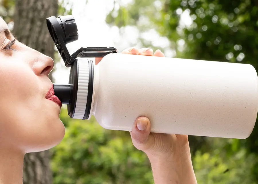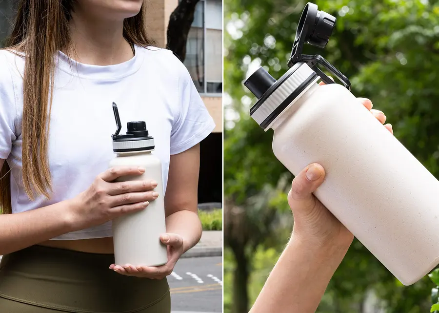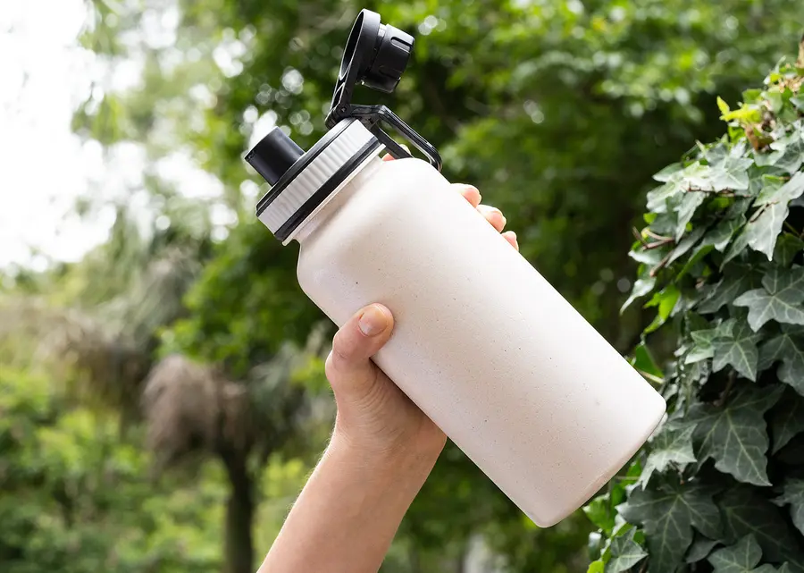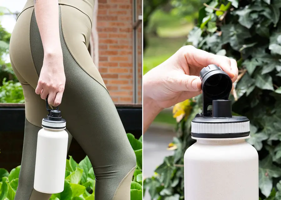 Botella deportiva ecológica de gran tamaño con tapa a presión y boquilla. Tiene una agarradera que permite un transporte fácil. Su capacidad de 1000 ml (33 oz), al estar elaborada con paja de trigo es amigable con el planeta.