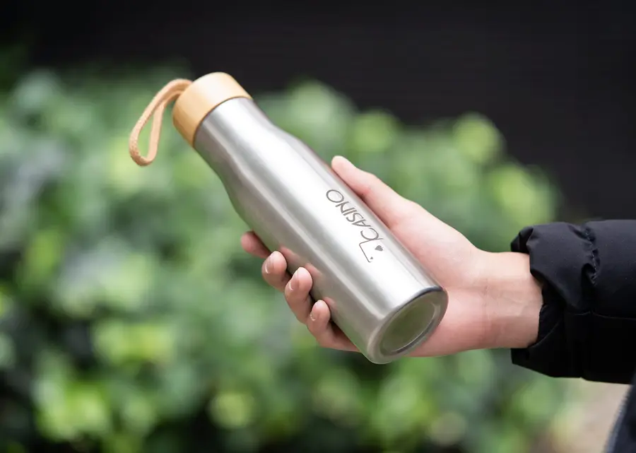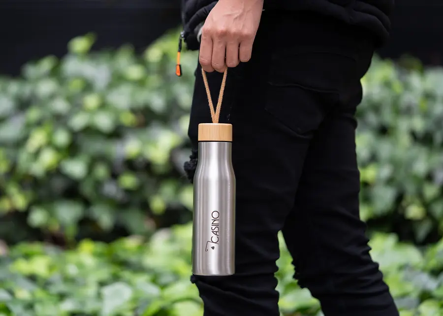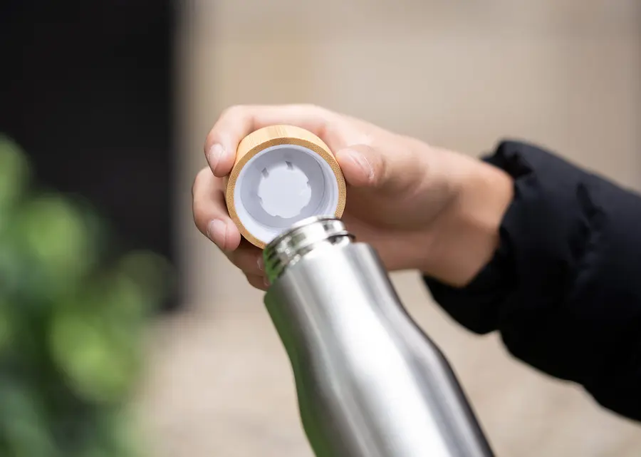 Botella de acero inoxidable de 500 ml (17 oz) con tapa de rosca hecha de bambú y cordón para un transporte sencillo. Un diseño simple pero encantador.