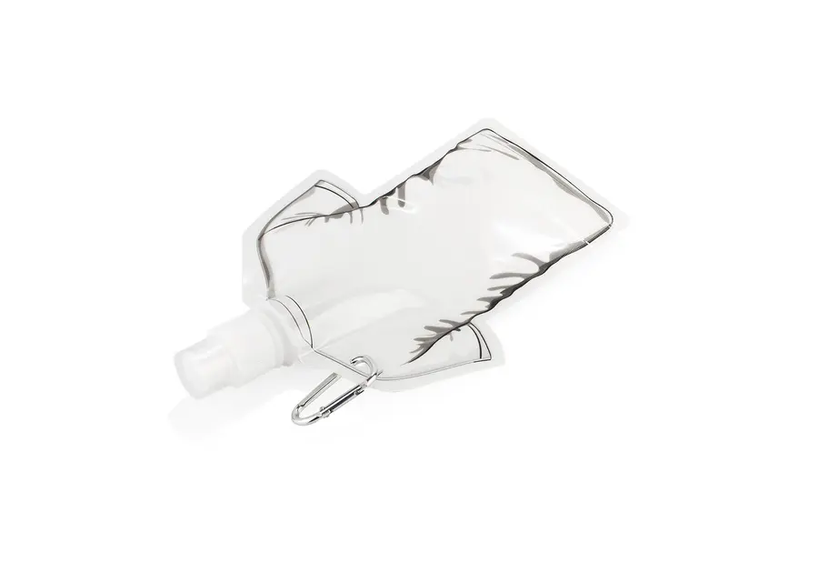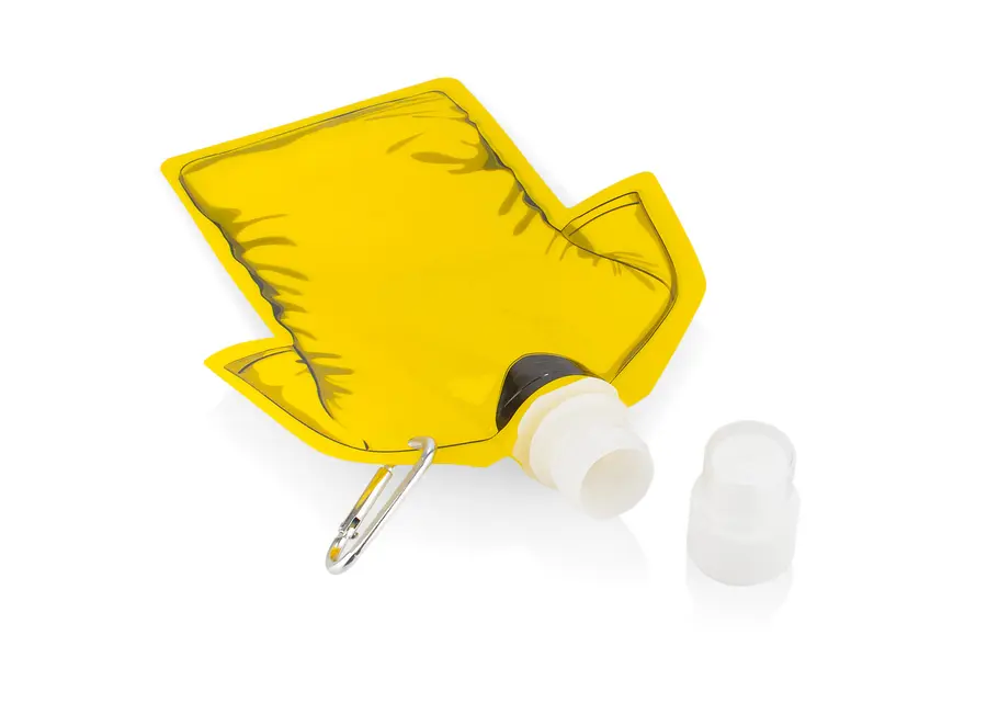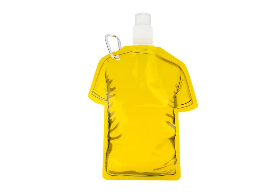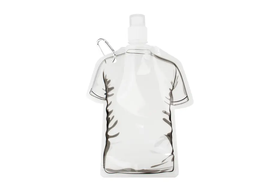Botella plegable con forma de camiseta, fabricada en PET, ideal para actividades al aire libre o eventos. Su diseño compacto permite doblarla cuando está vacía, ahorrando espacio en mochilas o bolsos. Cuenta con tapa de cierre giratorio y boquilla con tapa adicional, que garantiza un consumo higiénico y seguro. Incluye gancho carabinero para sujetarla fácilmente a mochilas, cinturones o llaveros. Capacidad: 480 ml / 16 Oz.