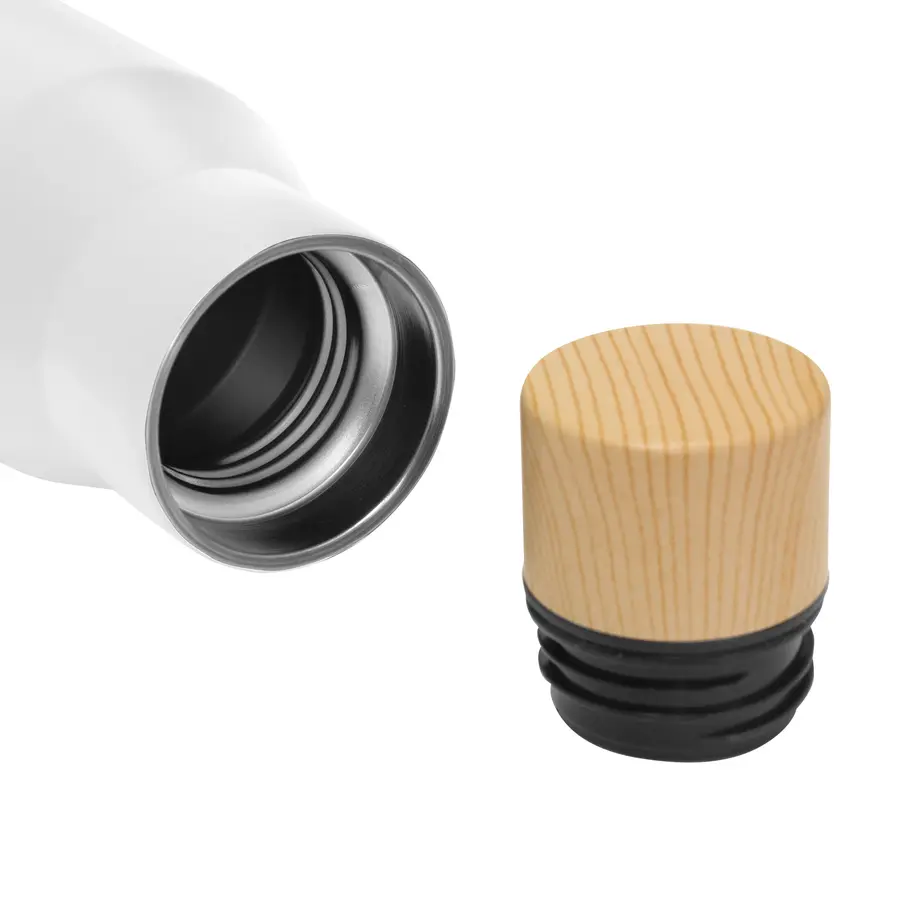 Acero inoxidable. Capacidad 500 ml. Botella doble pared, sellada al vacío. Interior de acero 304 y exterior de acero 201. Pintura acabado mate. Tapa a rosca con anillo de silicona, interior de acero 201 y exterior en PP imitación bambú. Mantiene por más de 12 hs la temperatura de las bebidas calientes y 24 hs de las bebidas frías. Presentación en caja de regalo kraft.