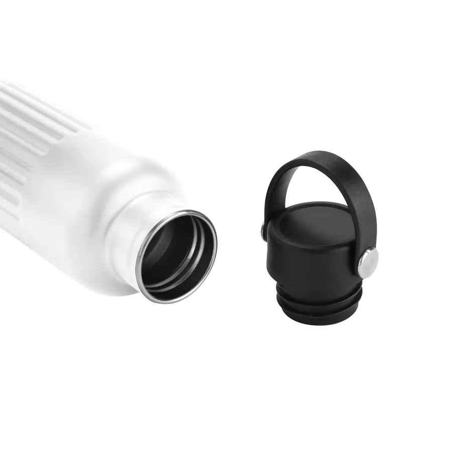 Resistente, pensada para el movimiento.Botella doble pared, sellada al vacío. Botella con aislamiento térmico. Tecnología vacuum. Interior de acero 304 reciclado y exterior de acero 201. Tapa a rosca de polipropileno, interior plástico. Asa reforzada de silicona. Pintura acabado semi mate. Cuerpo texturado para un mejor agarre. Mantiene hasta 12 hs la temperatura de las bebidas calientes y 24 hs de las bebidas frías. Medidas: Ø 7,5 x 22,5 cm. Capacidad: 500 ml. Materiales: Acero inoxidable, acero inoxidable reciclado, polipropileno y silicona. Presentación: en caja de regalo kraft.