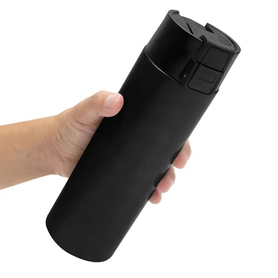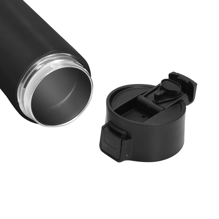 Acero inoxidable. Capacidad 450 ml. Botella con aislamiento térmico vacuum. Interior de acero 304 y exterior de acero 201. Pintura acabado mate. Tapa en PP con traba de seguridad y botón pulsador de apertura. Mantiene por más de 12 hs la temperatura de las bebidas calientes y 24 hs de las bebidas frías. Presentación en caja de regalo kraft.