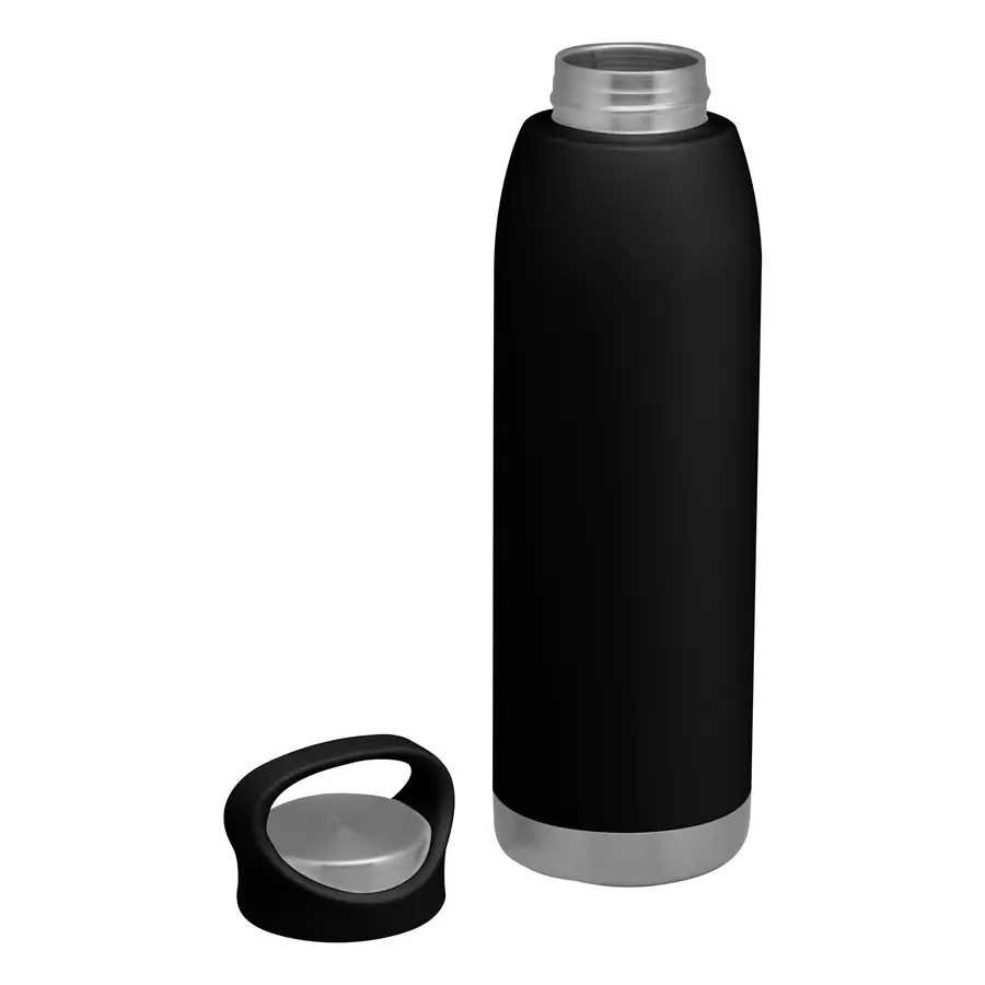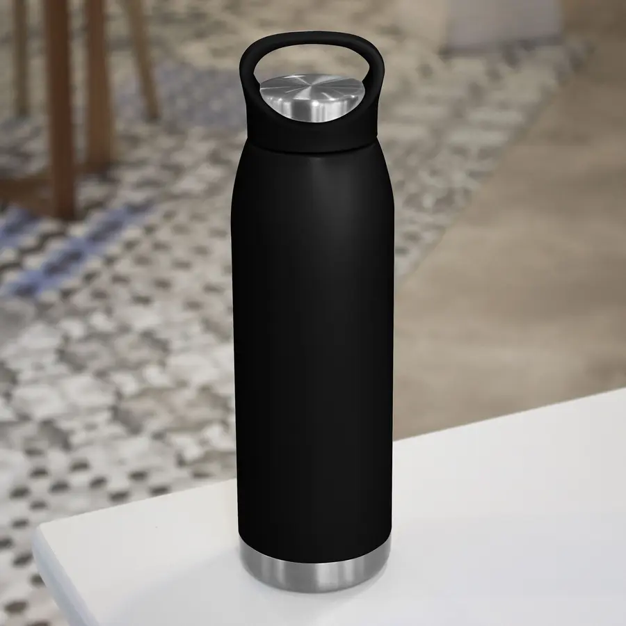 Ø 7,6 x 26,5 cm. Capacidad 600 ml. Acero inoxidable. Botella doble pared, sellada al vacío. tecnología vacuum. Interior en acero 304 y exterior en acero 201. Pintura en colores mate. Tapa combinada en plástico del mismo color de la botella y acero inoxidable 201. Mantiene hasta 12 hs la temperatura de las bebidas calientes y 24 hs de las bebidas frías. Presentación en caja de regalo.