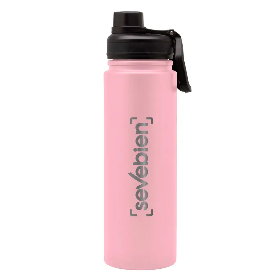 Ø 7,5 x 26 cm. Capacidad 720 ml. Acero inoxidable. Botella con aislamiento térmico vacuum. Interior en acero 304 y exterior en acero 201. Tapa con anillo de silicona, boquilla con cierre a rosca antigoteo y manija plástica para su agarre. Mantiene hasta 12 hs la temperatura de las bebidas calientes y 24 hs de las bebidas frías. Presentación en caja de regalo.