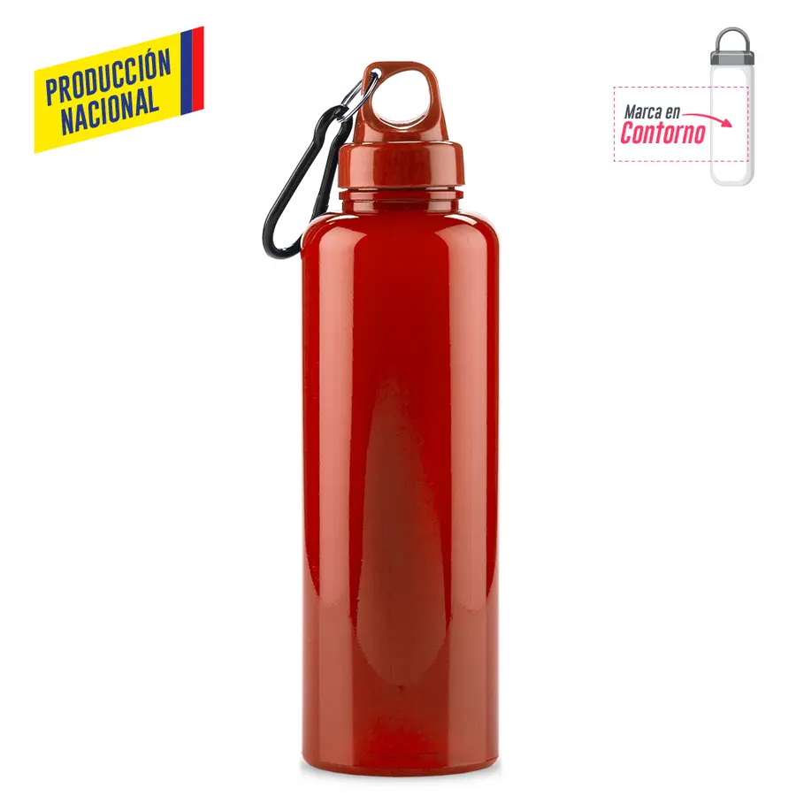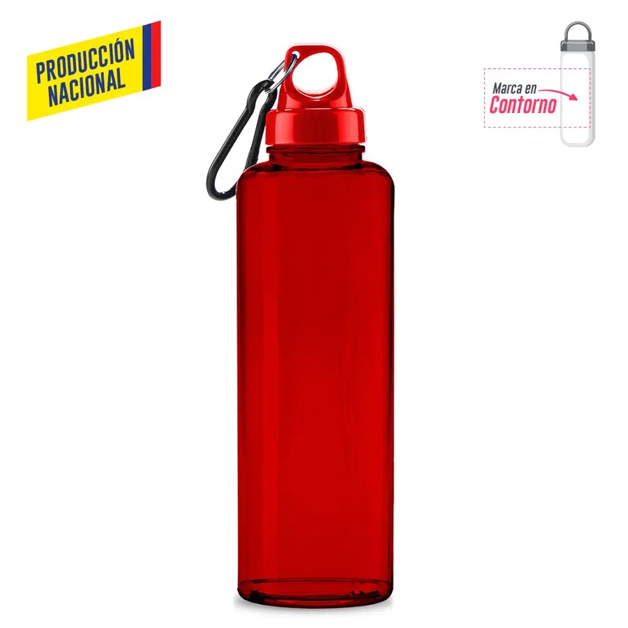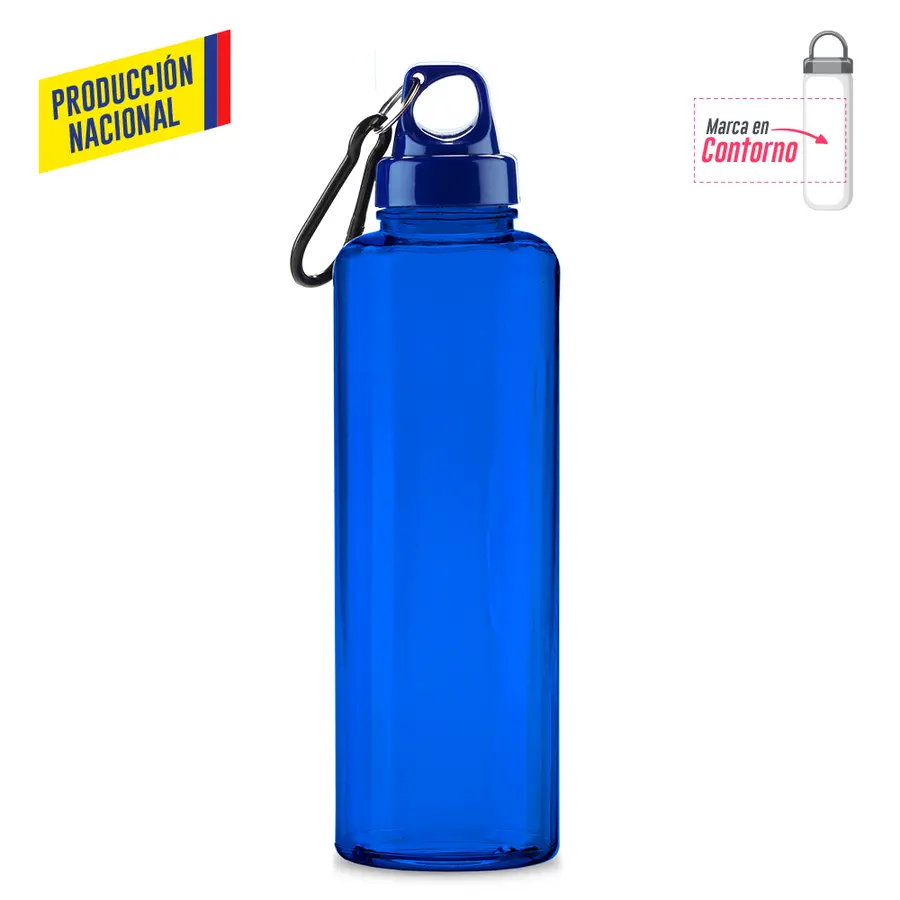 Botilito en PVC atóxico, tapa plástica y carabinero plástico. 750 ml. Atóxico. Tapa en color Sólido, botilito acabado sólido o acabado translúcido.