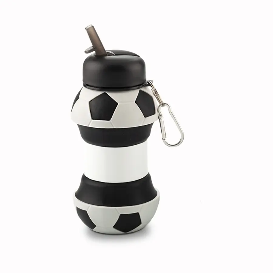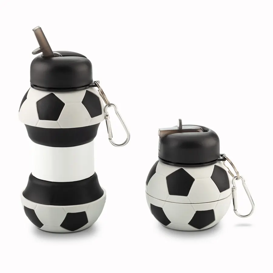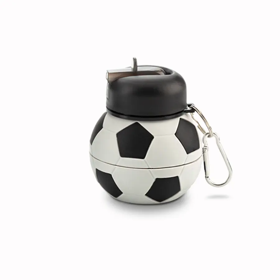 Botilito en silicona plegable con forma de balón de fútbol. Tapa rosca – pitillo. Incluye carabinero.