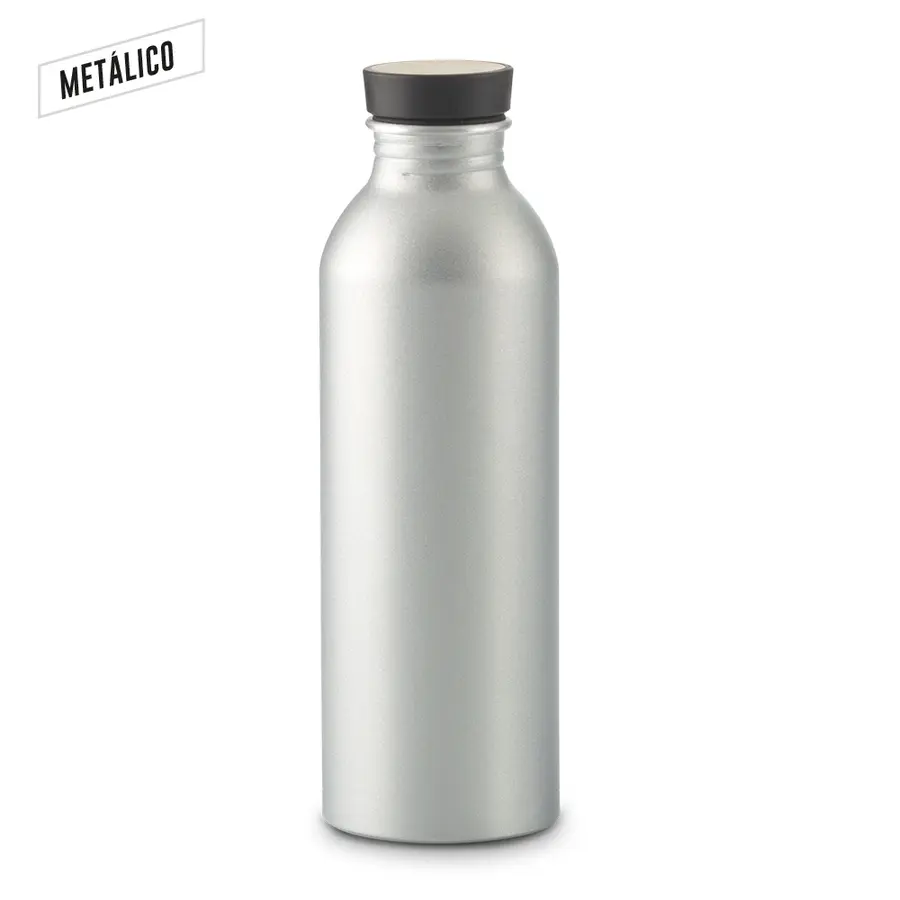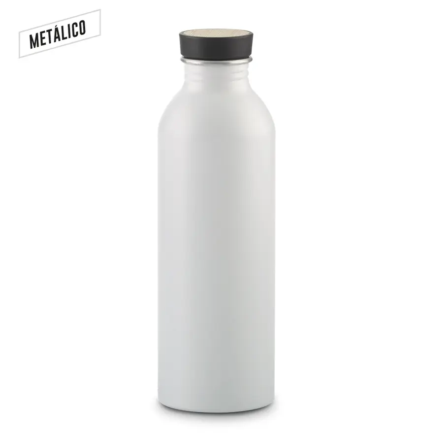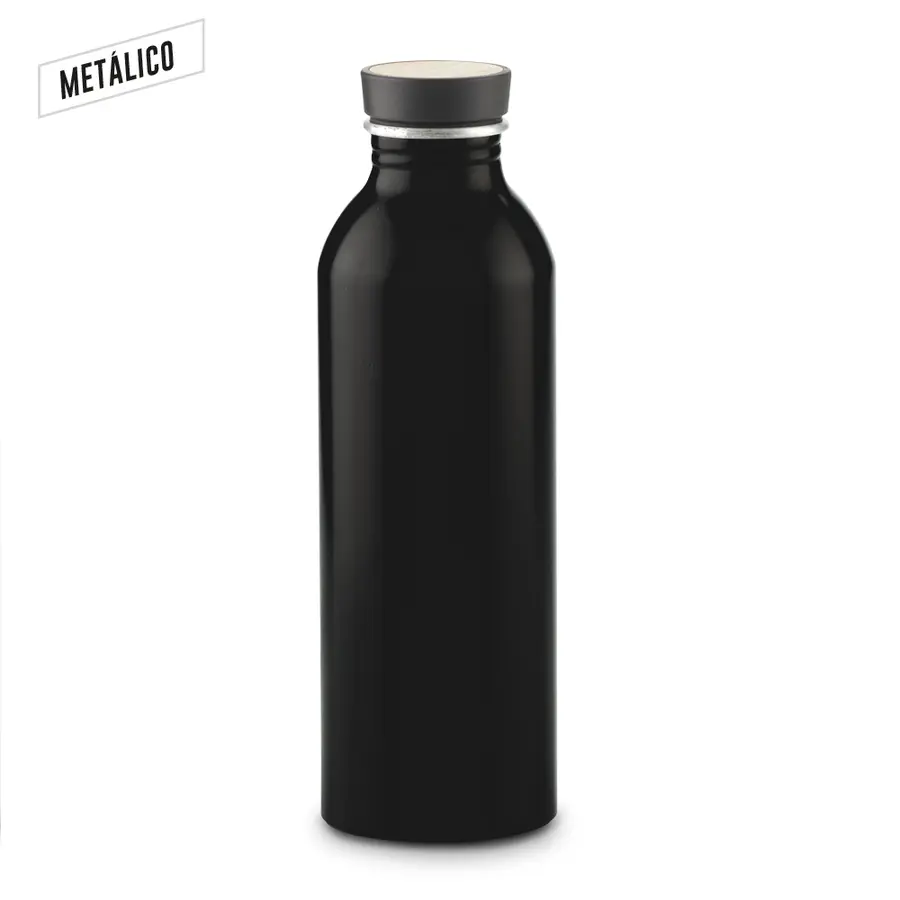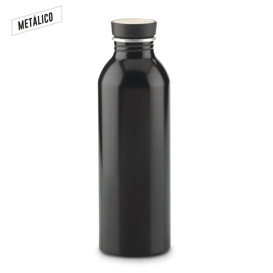 Botilito en aluminio con tapa en plástico y bambú. Empaque caja individual.